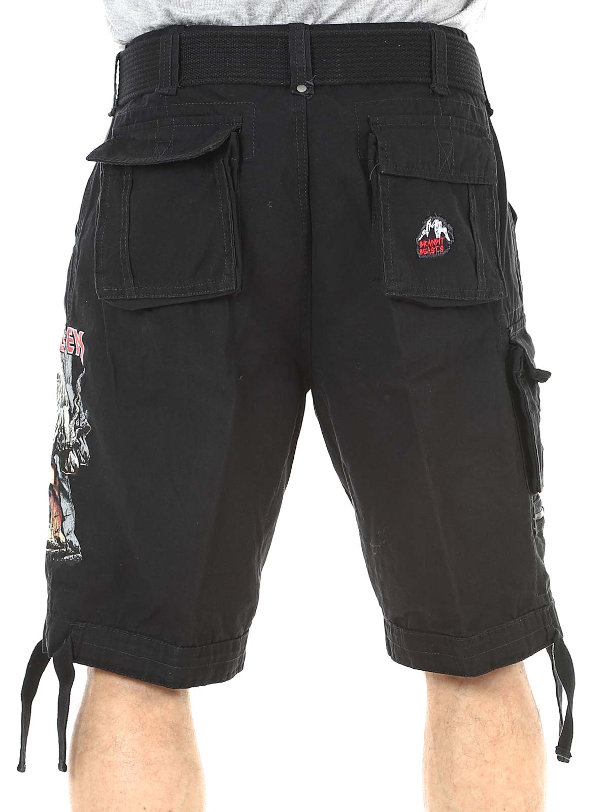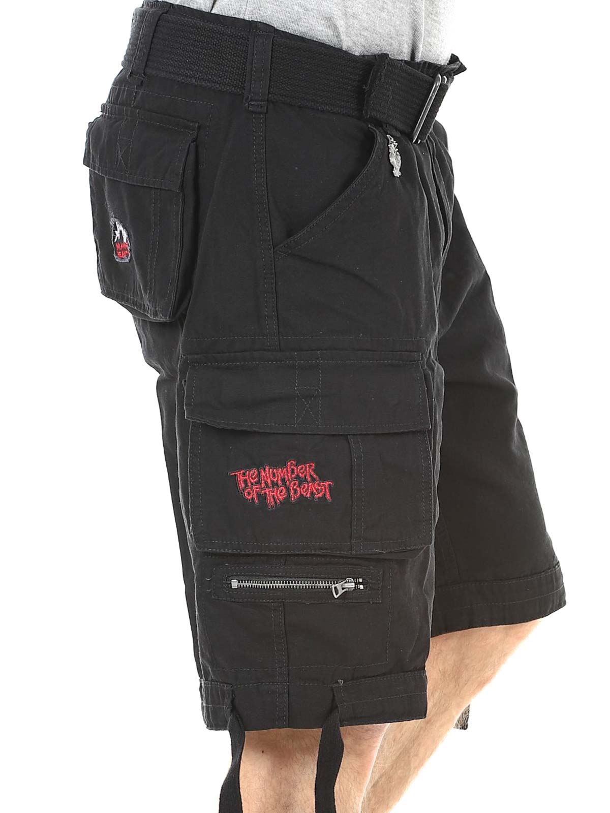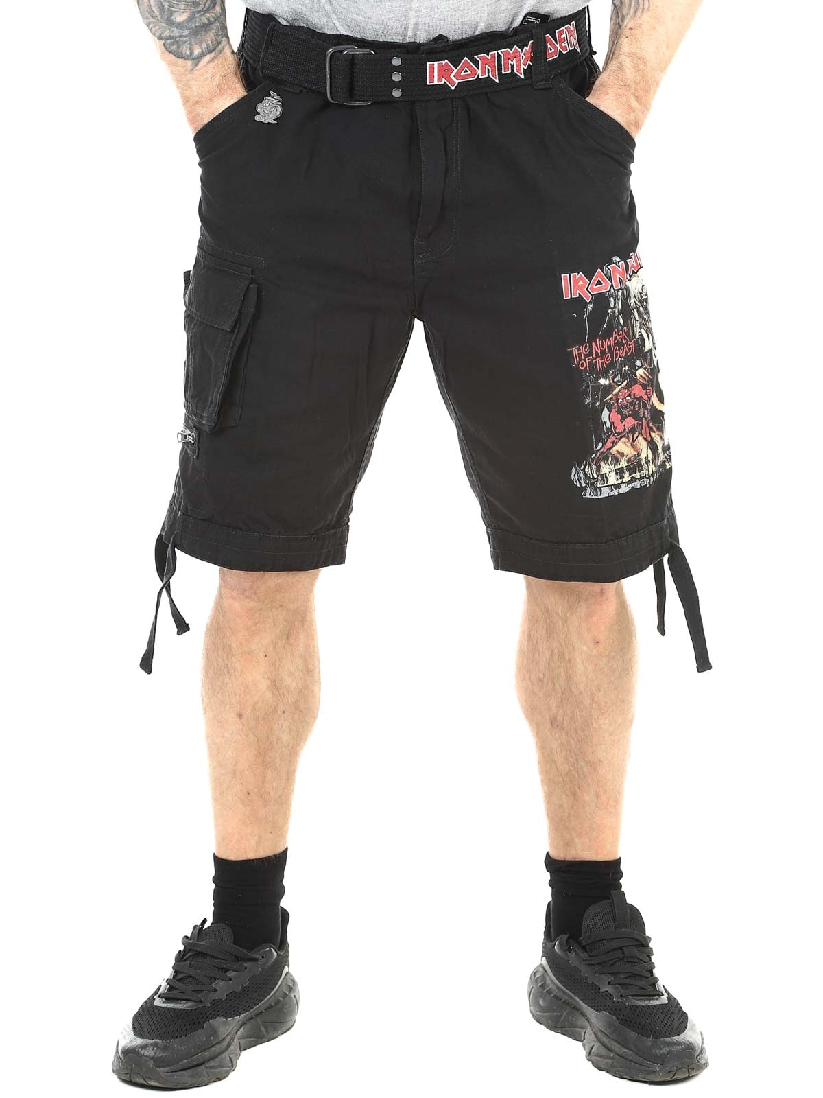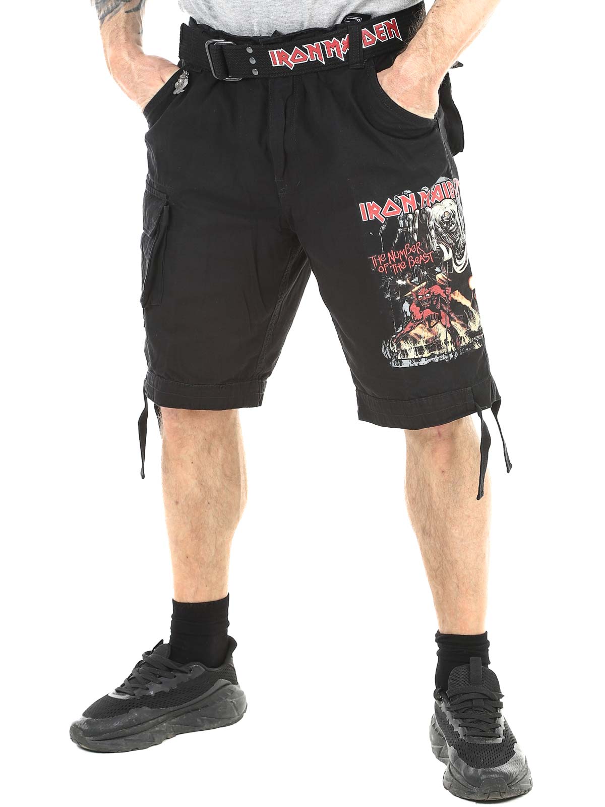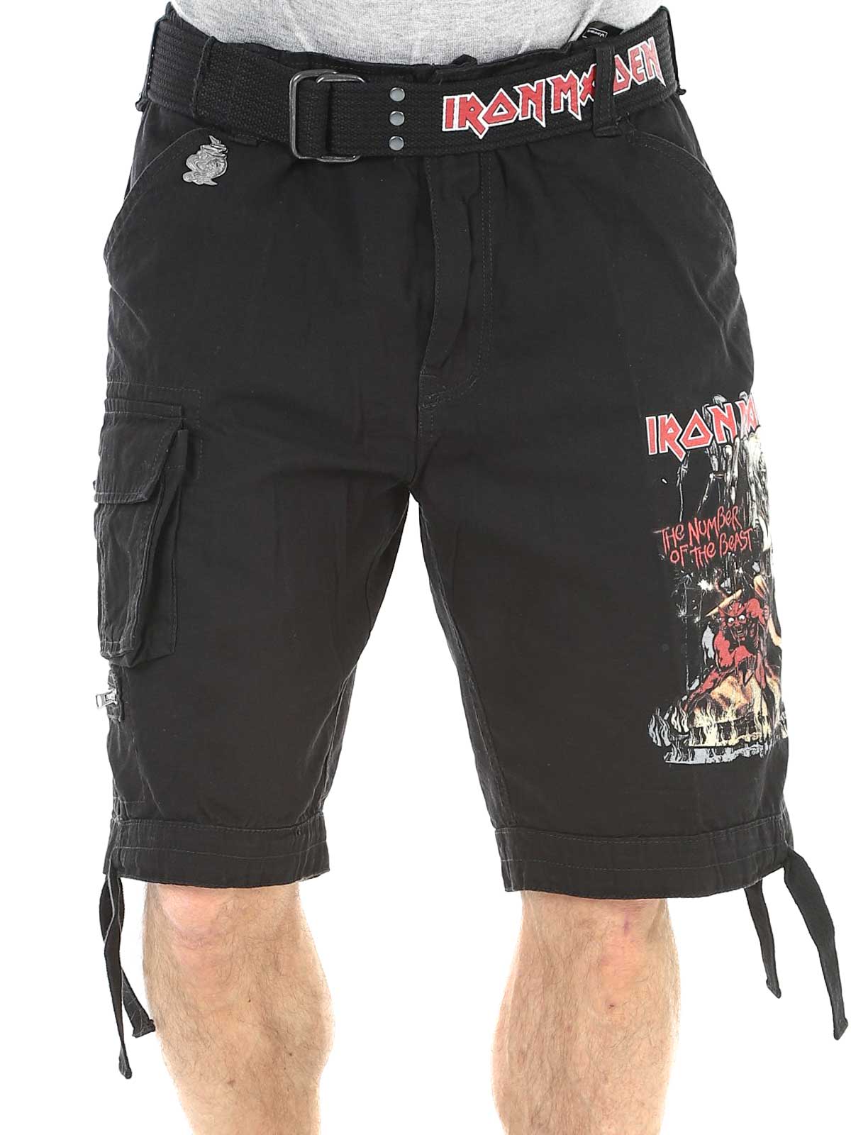 Tough cargo shorts for fans of Iron Maiden and classic rock style. These shorts combine a robust, military-inspired design with iconic details from the album "The Number Of The Beast". They feature several practical pockets as well as adjustable fabric straps at the waist and leg openings, making it easy to adjust the fit for optimal comfort.