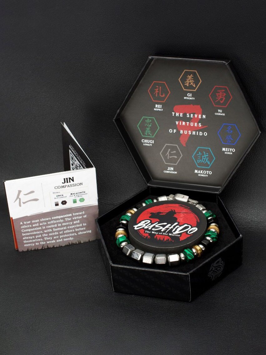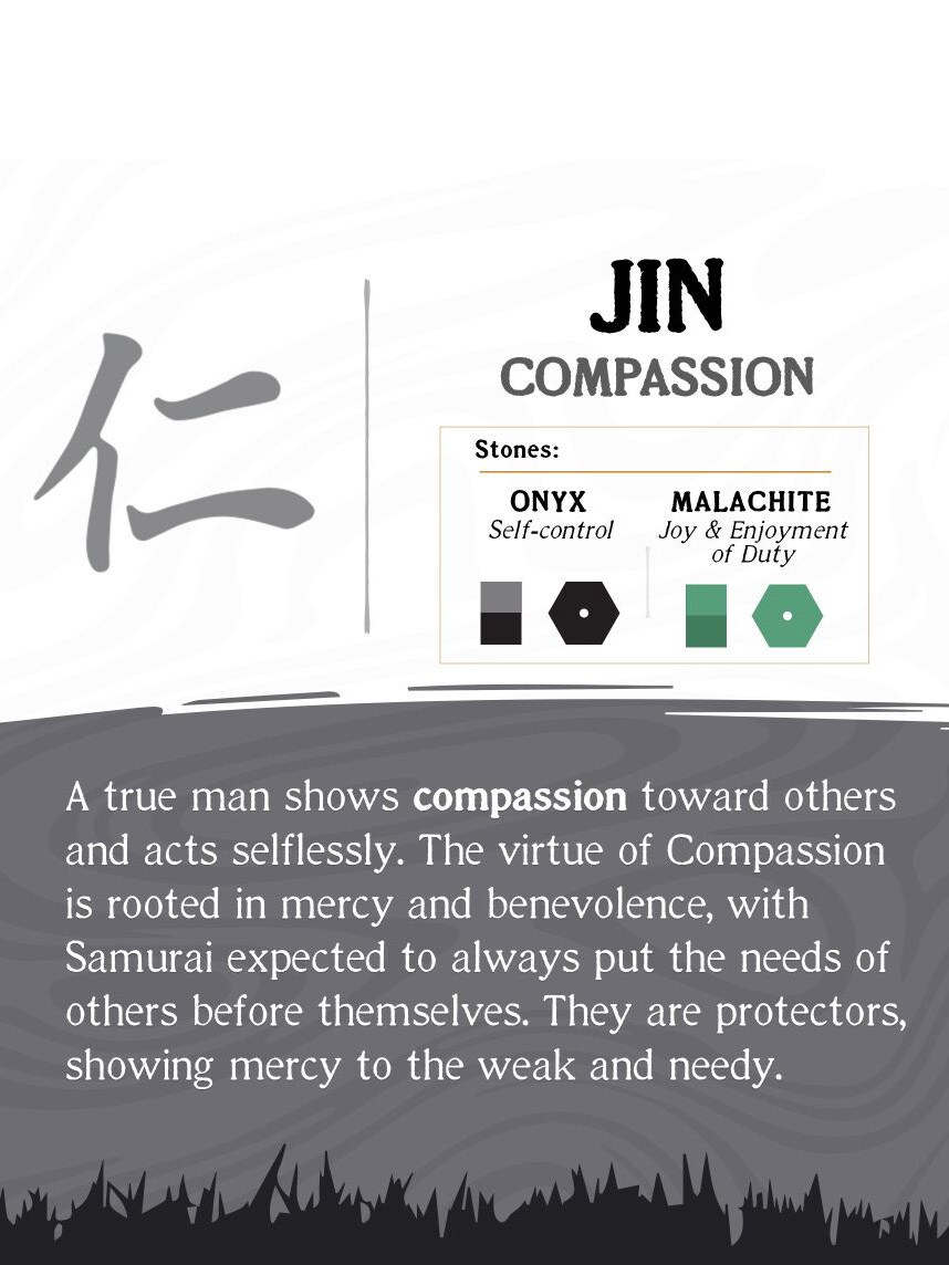 JIN: COMPASSION - A true man shows compassion toward others and acts selflessly. The virtue of Compassion is rooted in mercy and benevolence, with Samurai expected to always put the needs of others before themselves. They are protectors,showing mercy to the weak and needy.