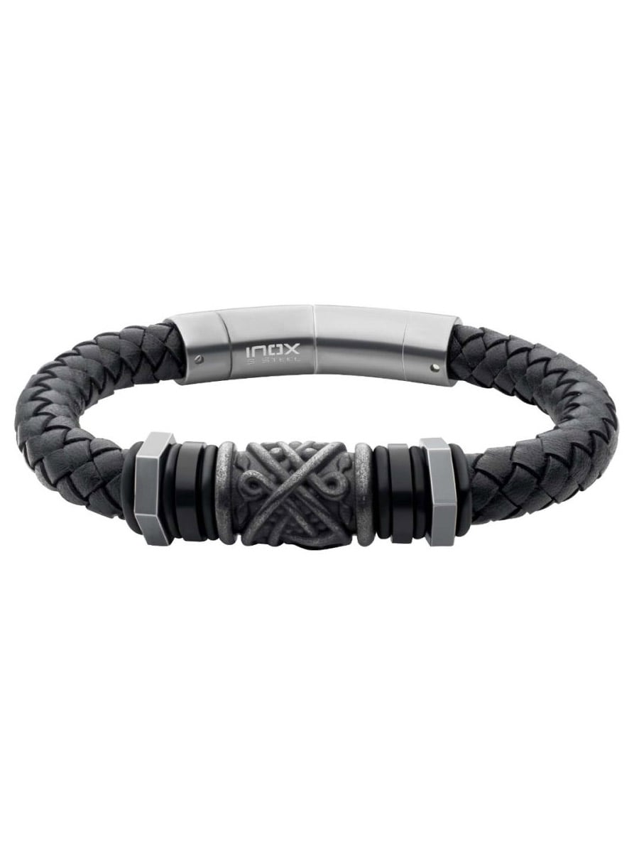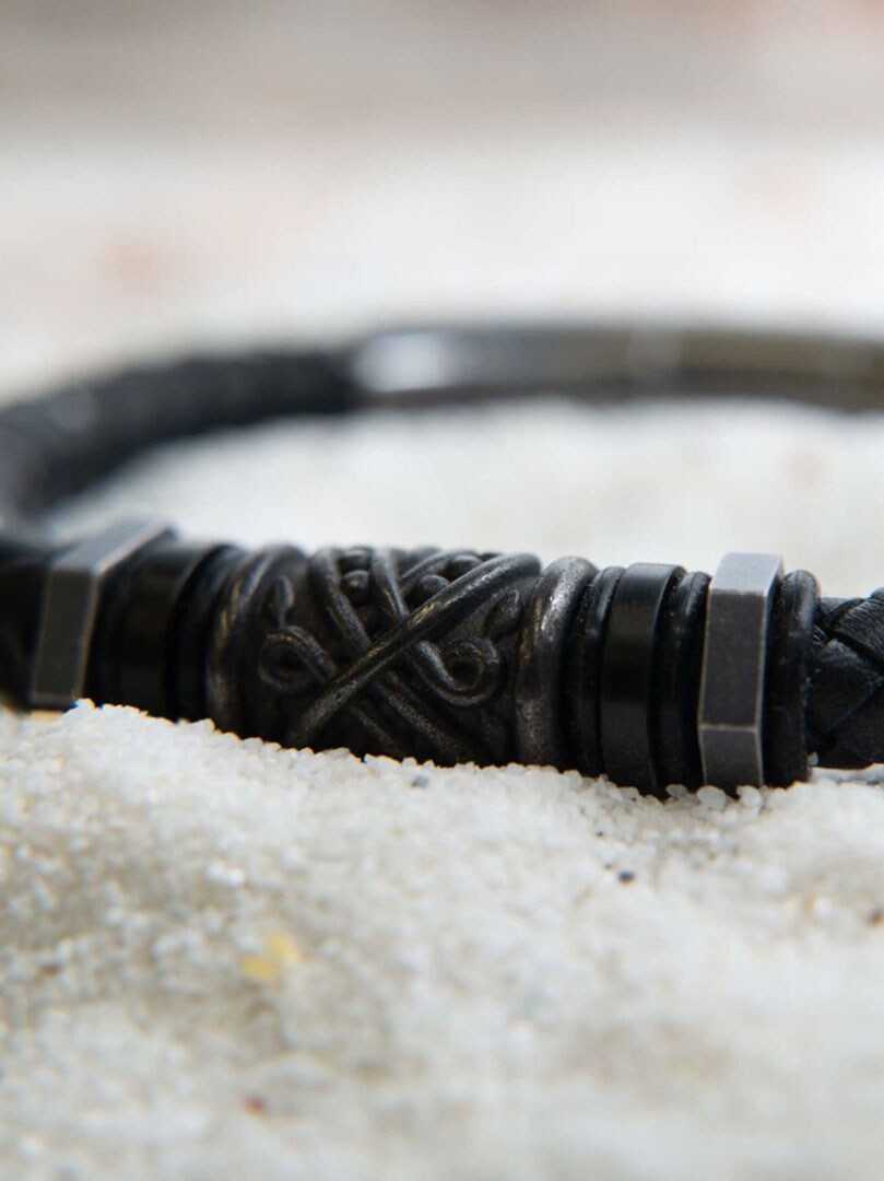 Masculine bracelet in black full-grain cow leather with a braided design and gunmetal-colored details. Equipped with a smooth tubular press-lock for secure and easy fastening. A perfect accessory for those who want something discreet yet full of character.