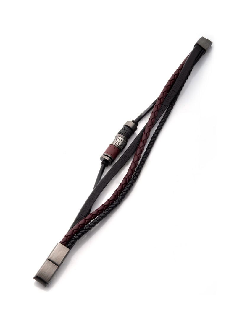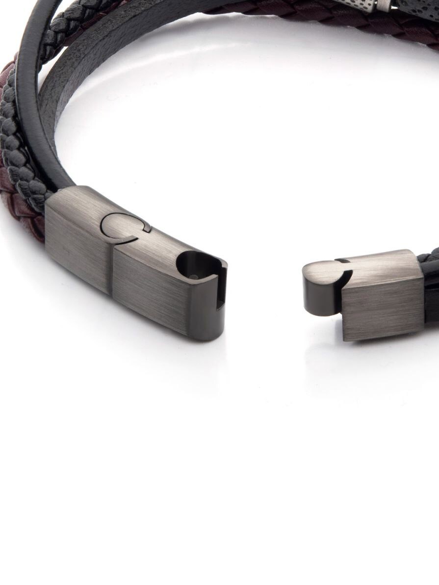 Multi-strand leather bracelet with lava stone and stainless steel details. Adjustable magnetic clasp.