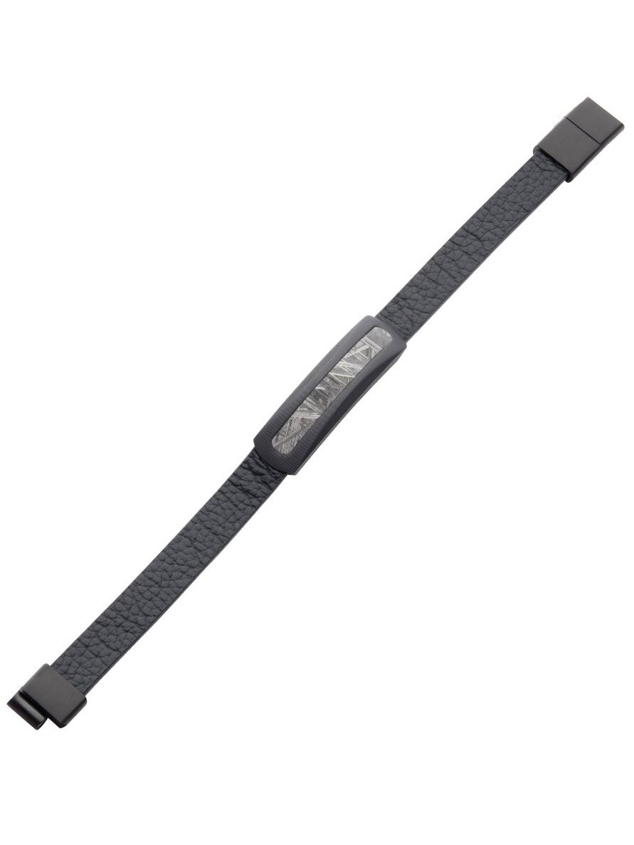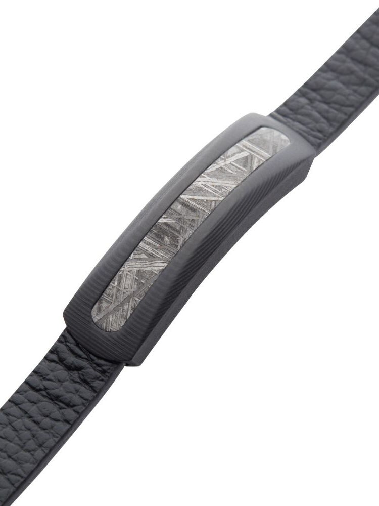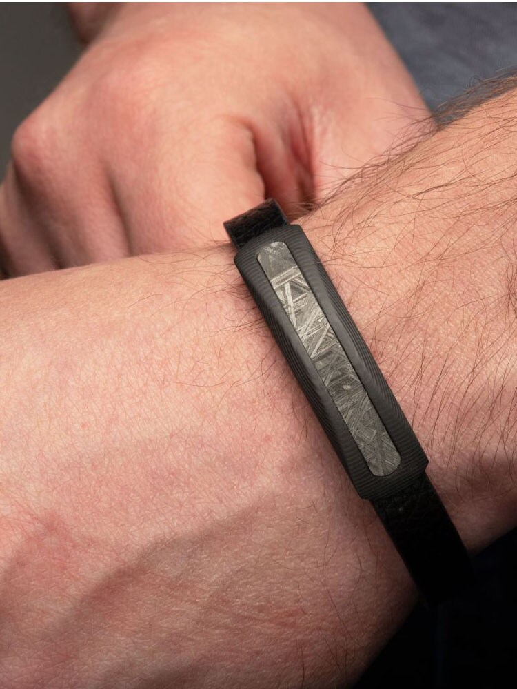 Unique bracelet in black embossed leather with exclusive carbon fiber details and an authentic meteorite inlay. Equipped with an adjustable stainless steel magnetic clasp for easy and secure use.