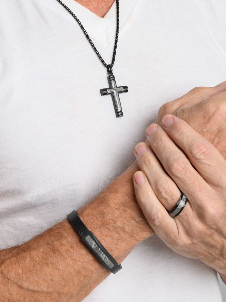 "Meteorite: A metallic and lustrous stone with a black or dark-colored surface exhibiting distinctive patterns or markings found in various parts of the world that enhances spiritual growth, transformation, and connection to the universe. Crafted using certified fragments of the Muonionalusta Iron Meteorite, which came from the core of Asteroid that landed in Scandinavia over 120,000 years ago. Rocking a piece of space history has never been so easy. The Asteroid itself predates our own Planet!"