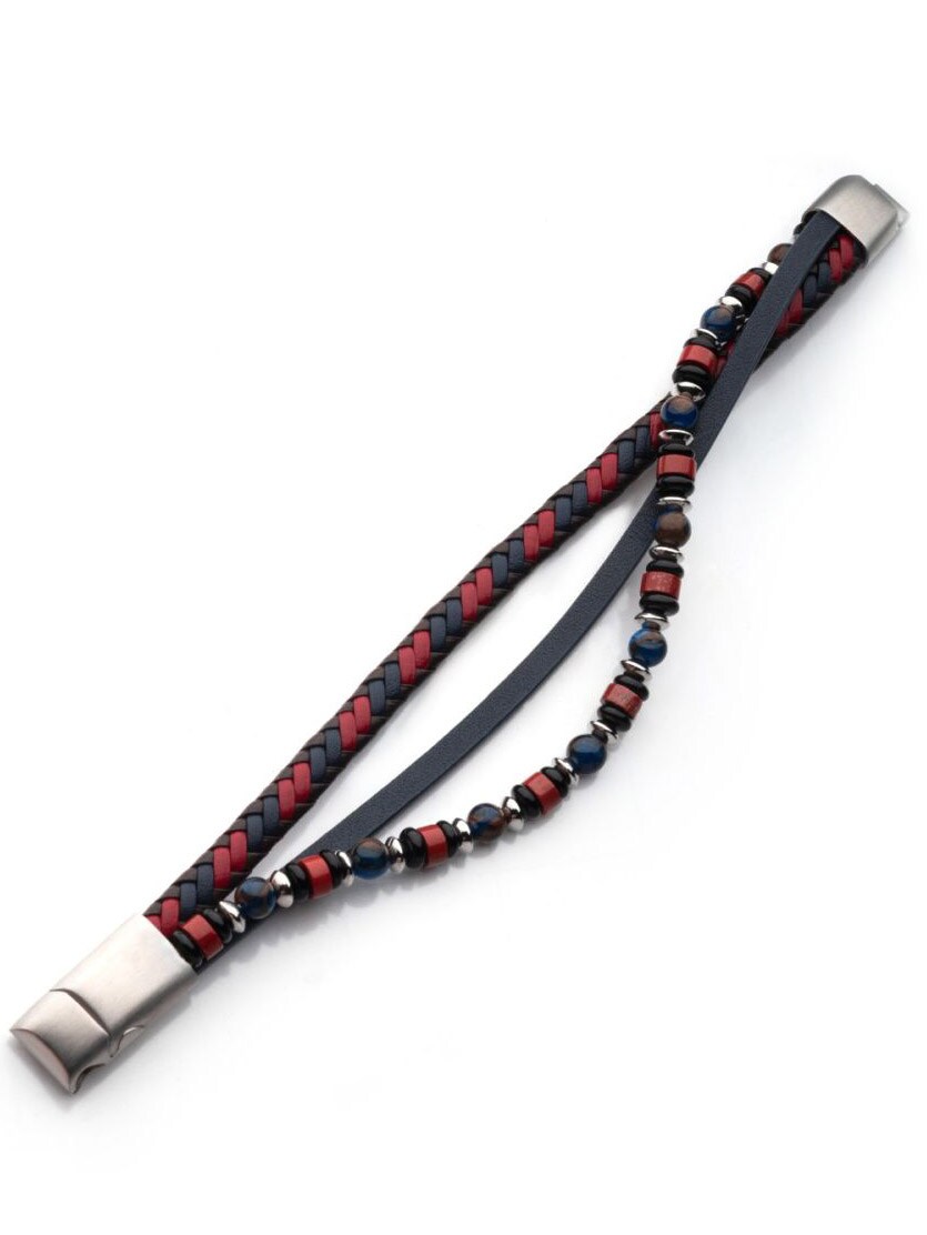 Colorful multi-strand bracelet in full-grain cow leather combined with beads of black onyx, blue golden stone, and red agate. The bracelet features a steel magnetic clasp and an extra adjustable link for a perfect fit. A modern accessory with both color and character.