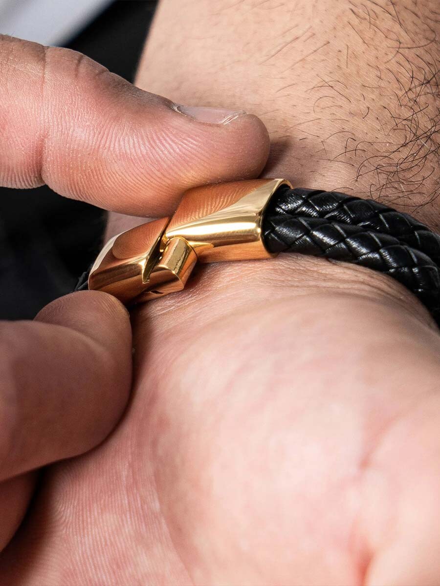 An elegant and versatile bracelet made from braided leather, featuring a polished magnetic clasp in stainless steel. The clasp is easy to operate with one hand, and the bracelet comes with an extra extension link so you can adjust the length for a perfect fit. Ideal for anyone who wants a discreet yet character-rich accessory that elevates the entire look!