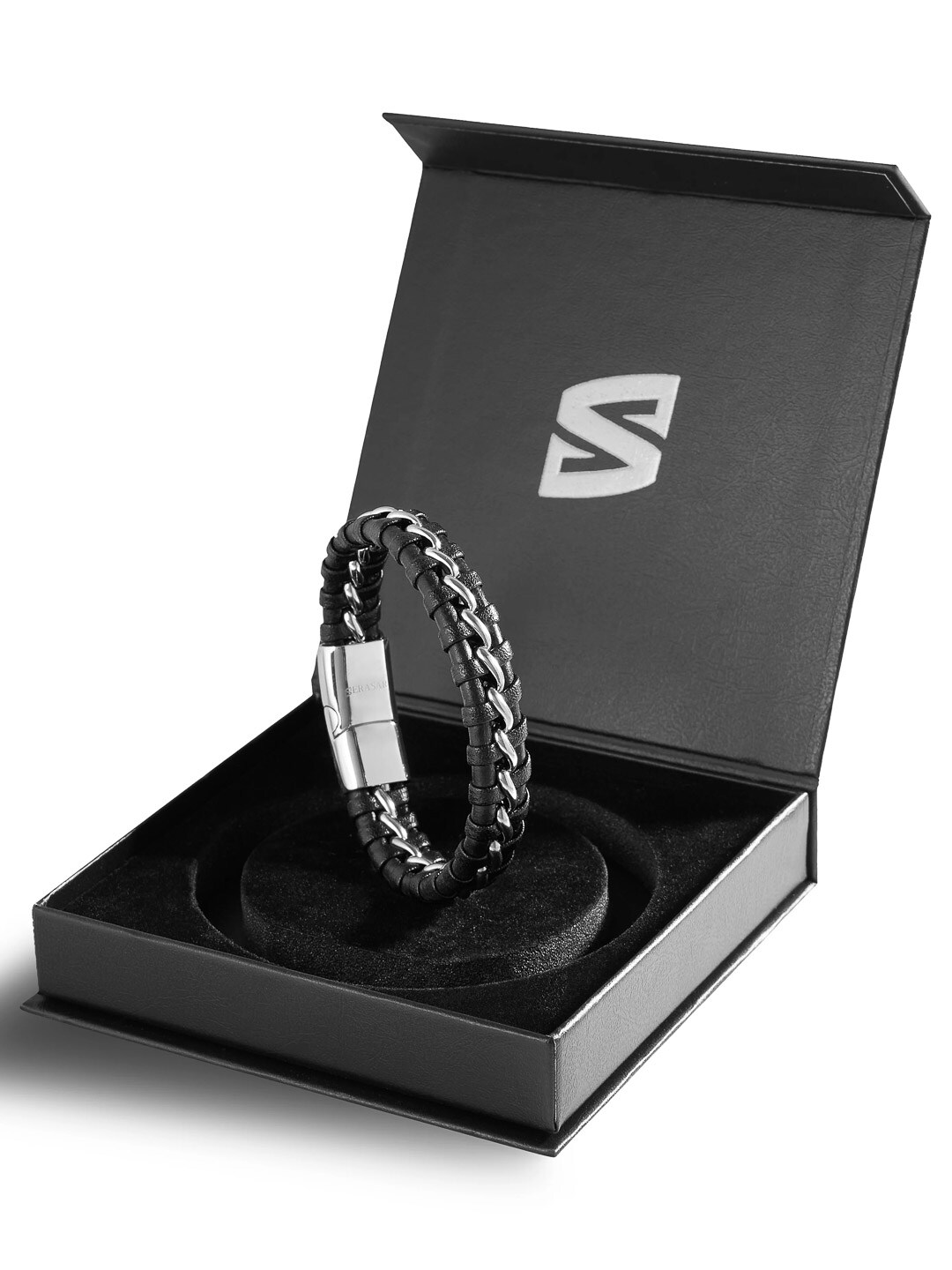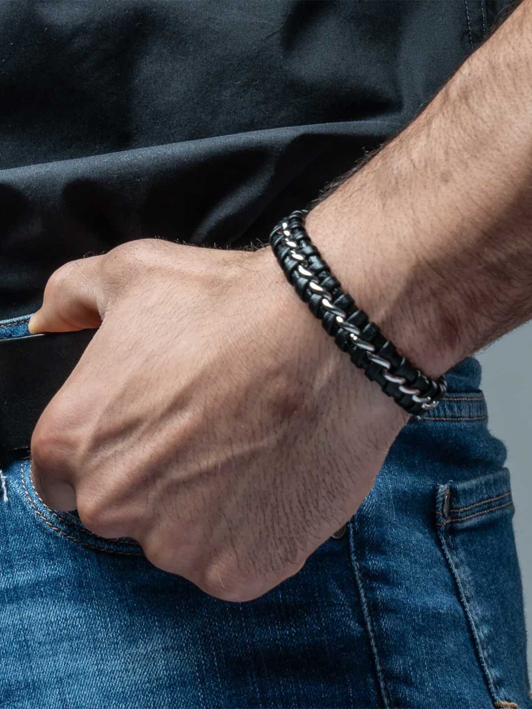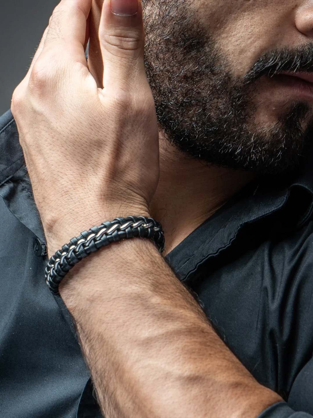 A stylish bracelet made from a braided mix of genuine leather and stainless steel. The polished magnetic clasp makes it easy to put on and take off while keeping it secure throughout the day. The bracelet comes with an additional extension link for an adjustable length – perfect if you want a bit more room or are unsure about sizing. A timeless accessory that suits any outfit.