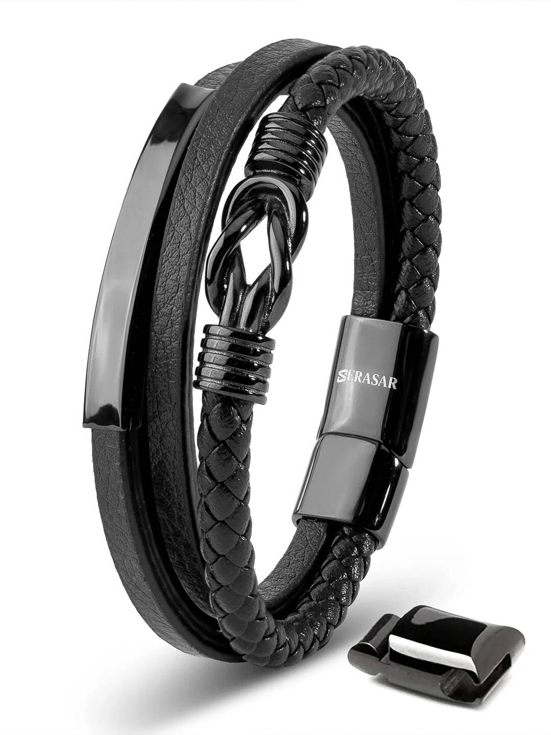 An elegant bracelet combining black genuine leather with polished stainless steel elements. The secure magnetic clasp makes it easy to put on and take off, and the included extension link allows you to adjust the length for the perfect fit. The design balances classic style with modern attitude – ideal for both everyday wear and special occasions!