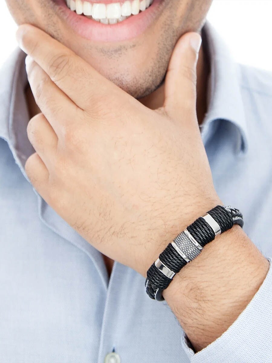 A bold bracelet combining braided leather with stainless steel details for a modern, robust look. The clasp is easy to operate with one hand and comes with an extra extension link, allowing effortless adjustment for the perfect fit. A stylish accessory that elevates any outfit.