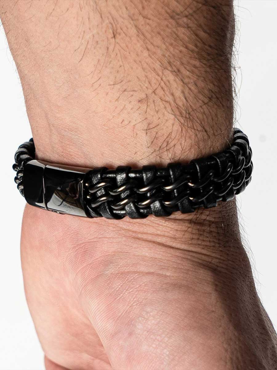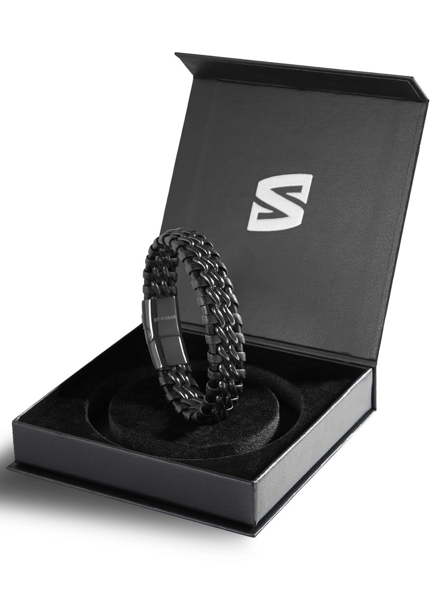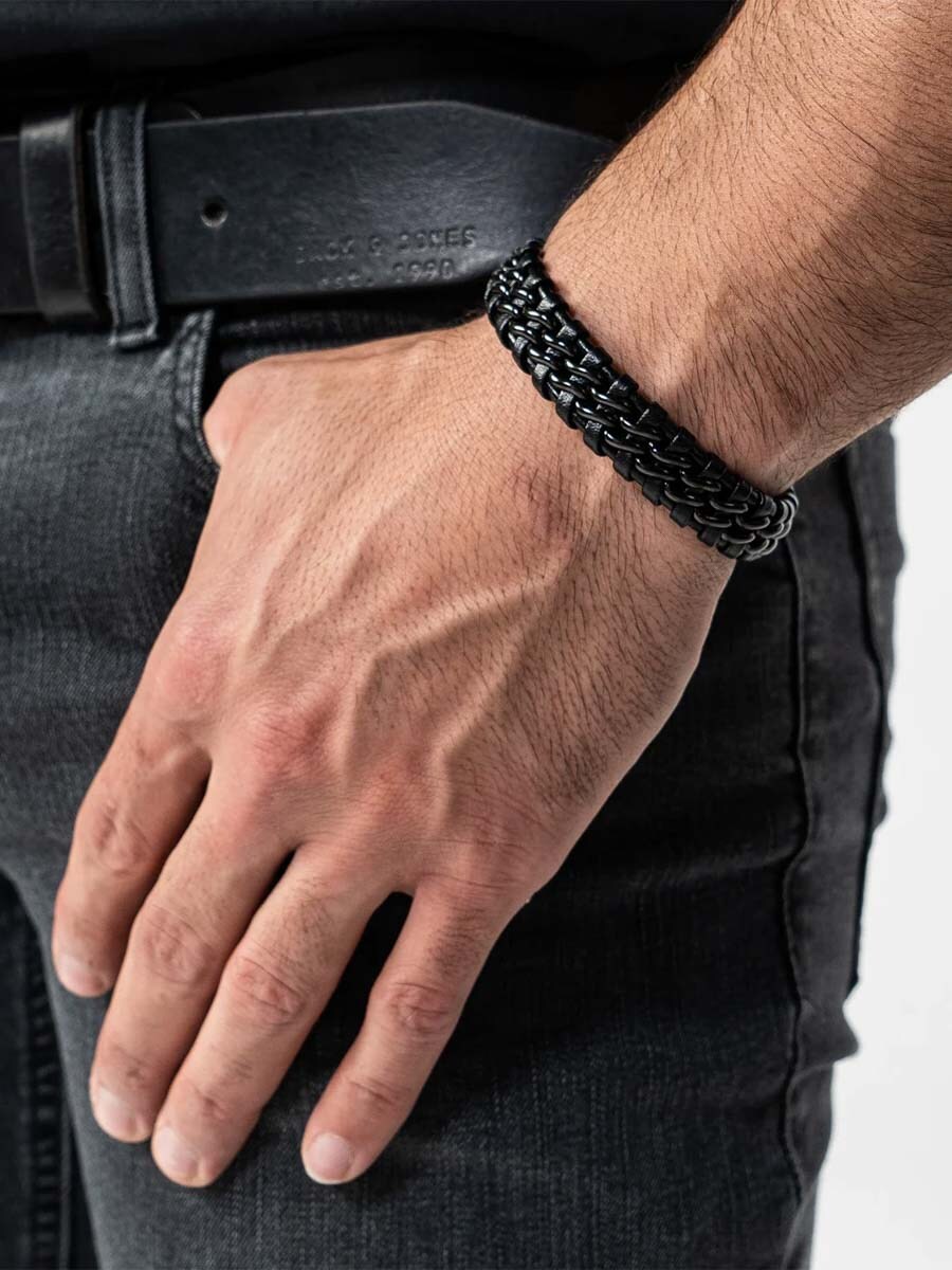 A stylish bracelet made from a braided mix of genuine leather and stainless steel. The polished magnetic clasp makes it easy to put on and take off while keeping it secure throughout the day. The bracelet comes with an additional extension link for an adjustable length – perfect if you want a bit more room or are unsure about sizing. A timeless accessory that suits any outfit.
