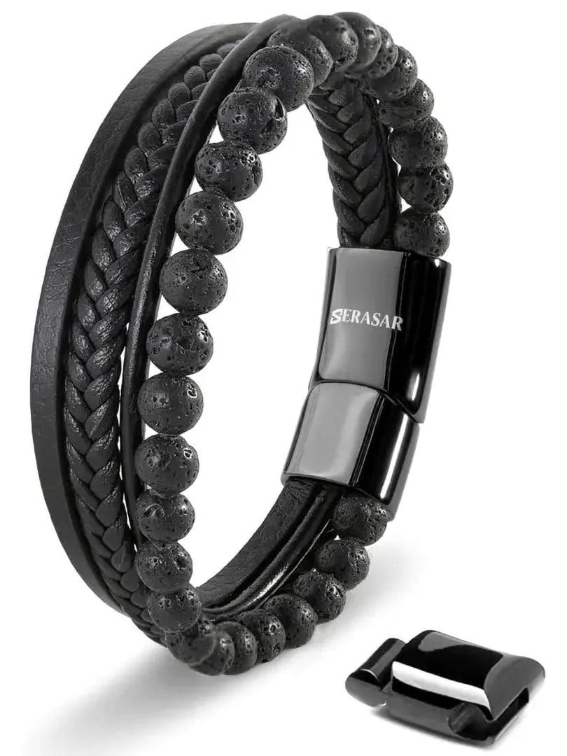A stylish bracelet combining braided leather with matte black lava stones for a modern and powerful look. The polished stainless steel magnetic clasp makes it easy to put on and take off while keeping it secure on the wrist. Comes with an additional extension link for adjustable length and a perfect fit. A sophisticated accessory suitable for both everyday wear and special occasions.