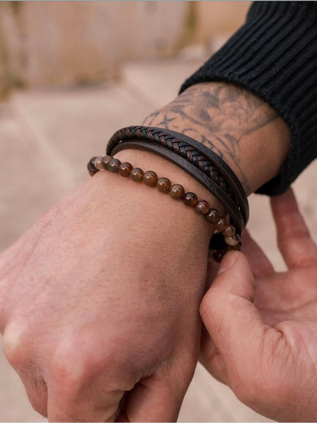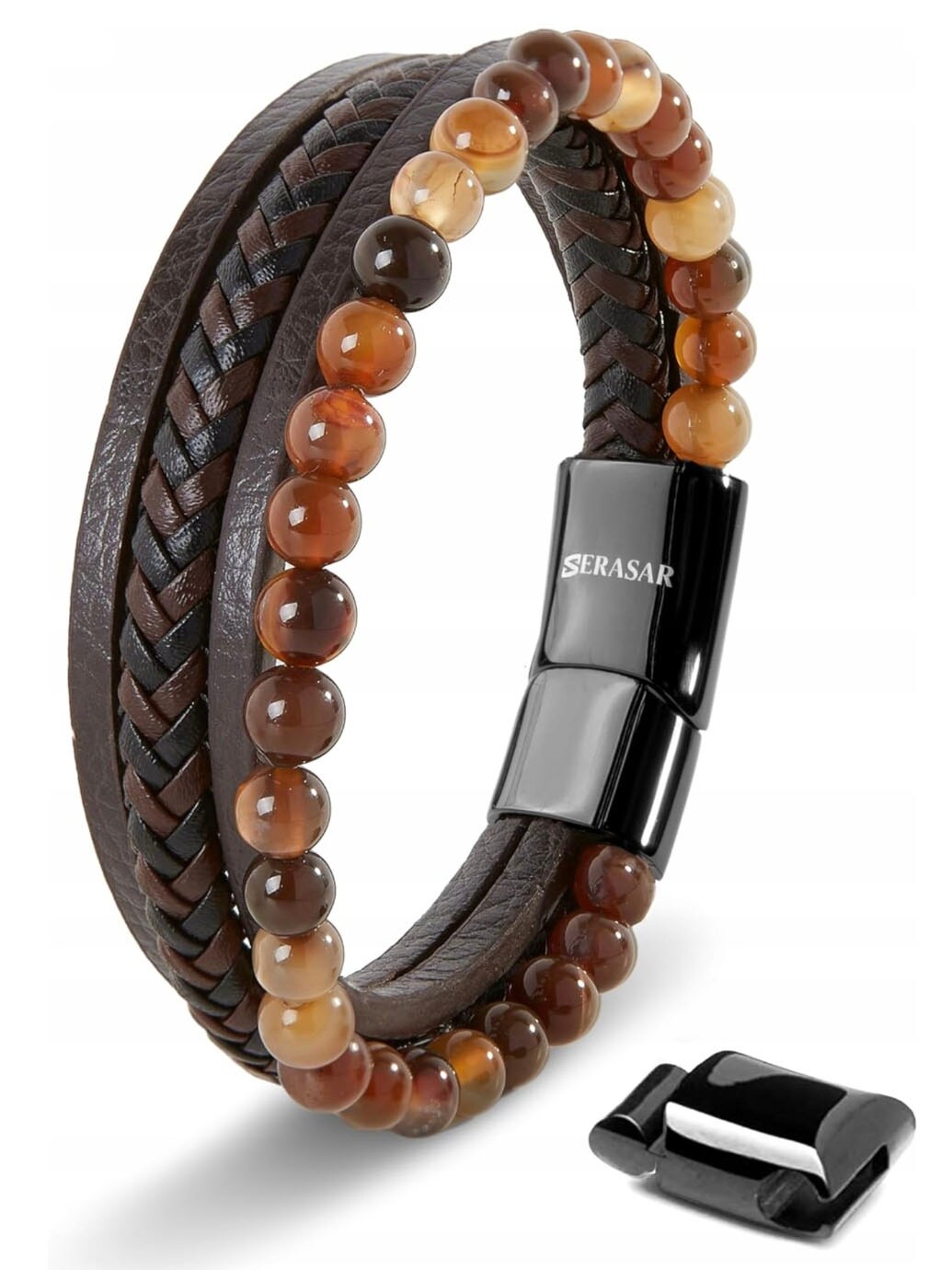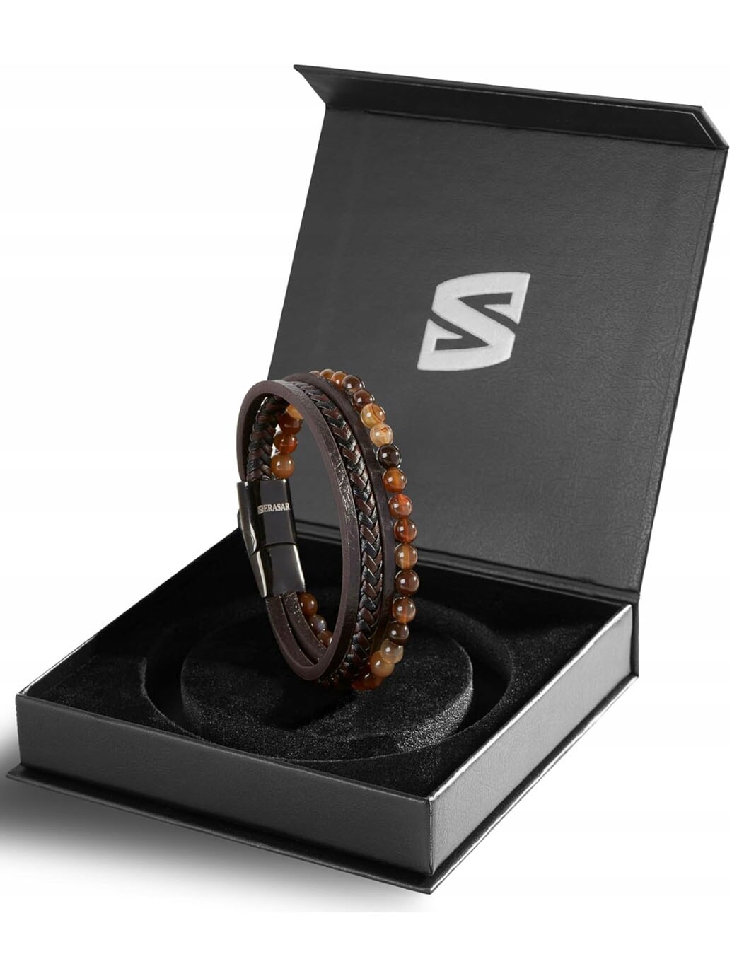 A stylish bracelet combining braided leather with matte black lava stones for a modern and powerful look. The polished stainless steel magnetic clasp makes it easy to put on and take off while keeping it secure on the wrist. Comes with an additional extension link for adjustable length and a perfect fit. A sophisticated accessory suitable for both everyday wear and special occasions.