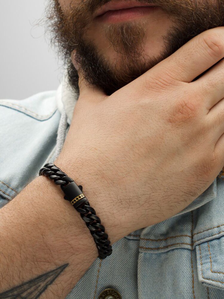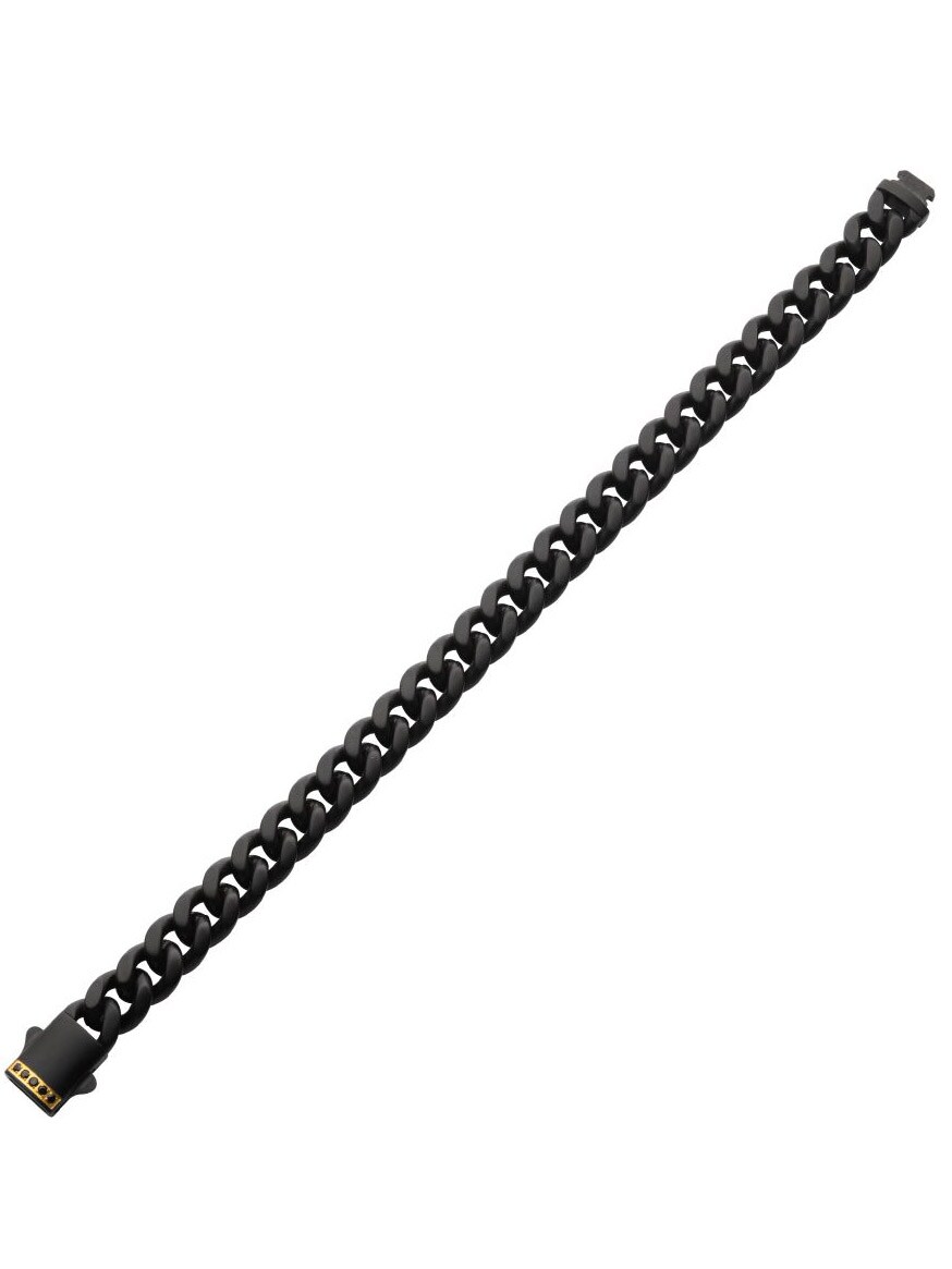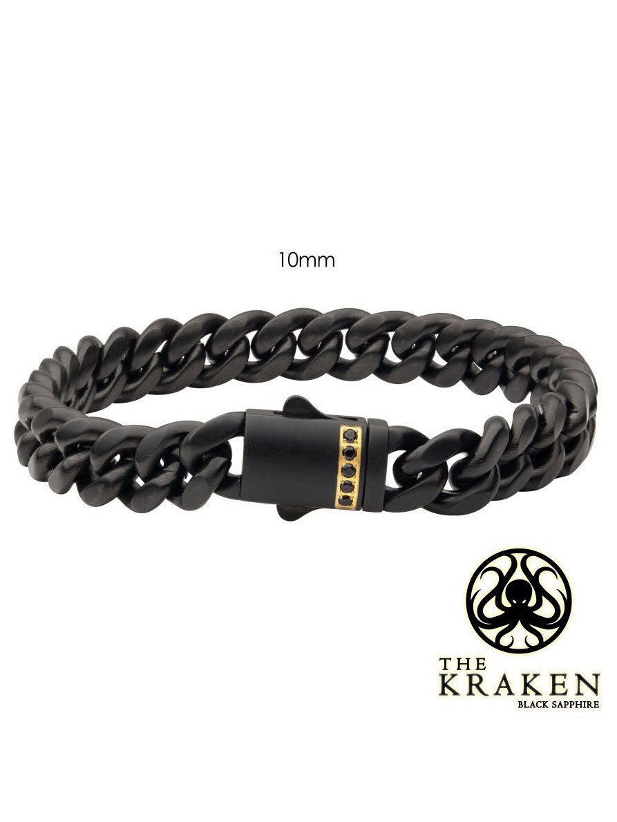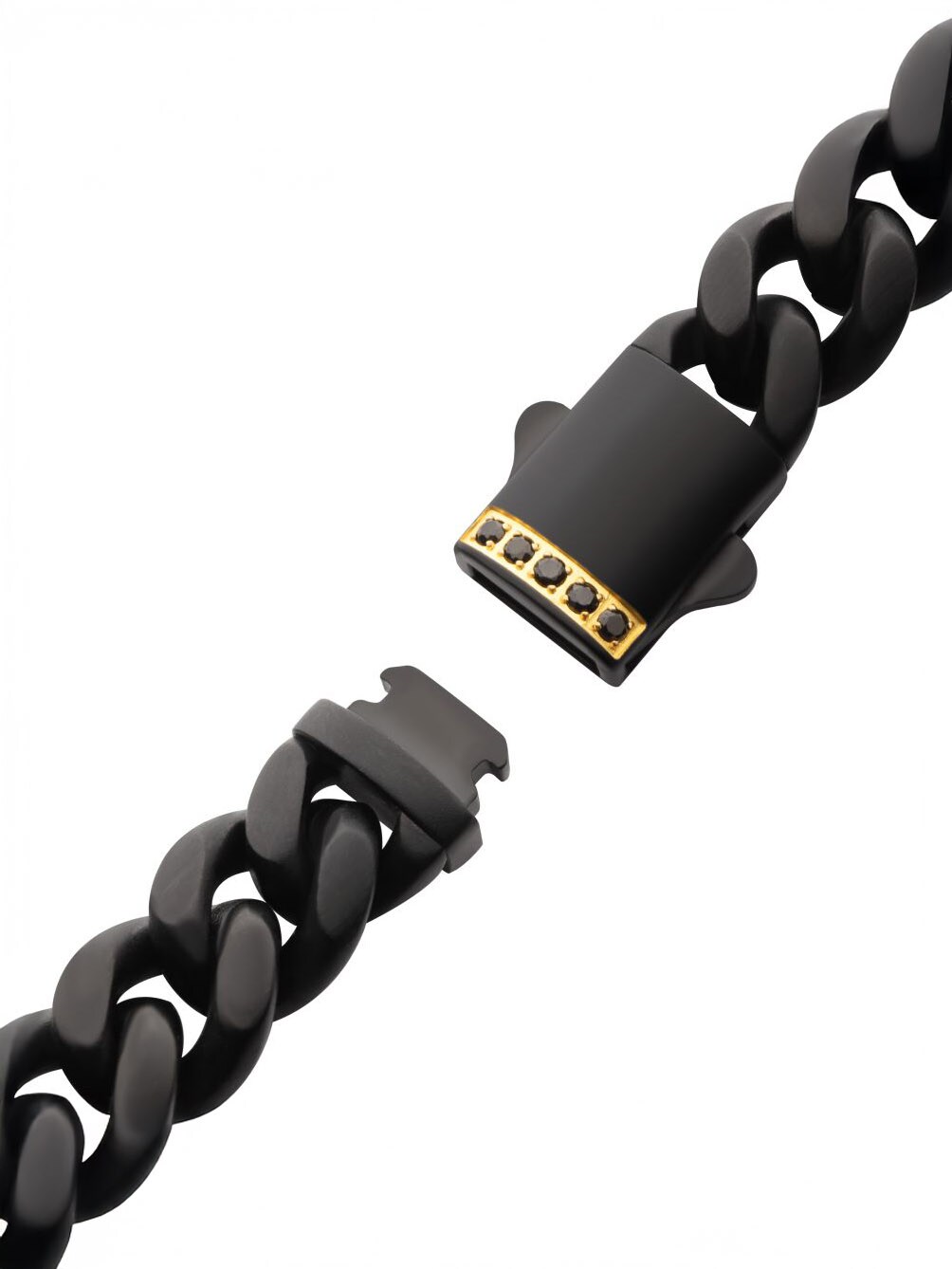 Stainless steel chain bracelet with black IP plating, designed with Sapphire stones at the clasp and has a matte finish.