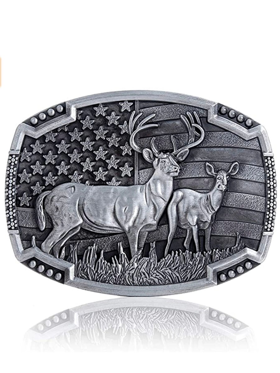 Belt buckle with deer motif and American flag.