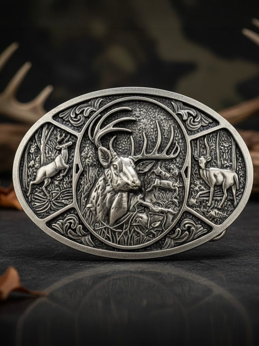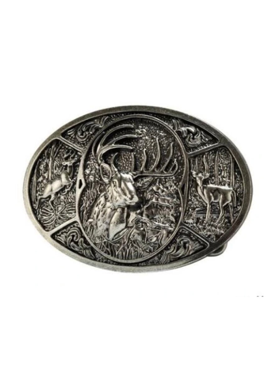 An oval buckle with deep relief featuring a majestic buck surrounded by forest scenery. The buckle fits belts up to 4 cm wide, making it easy to pair with most standard belts with interchangeable buckles.