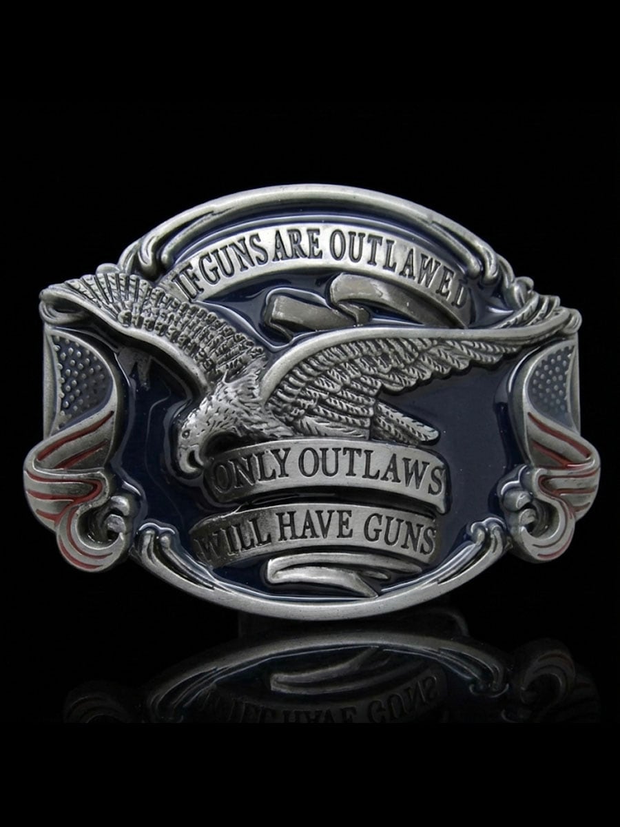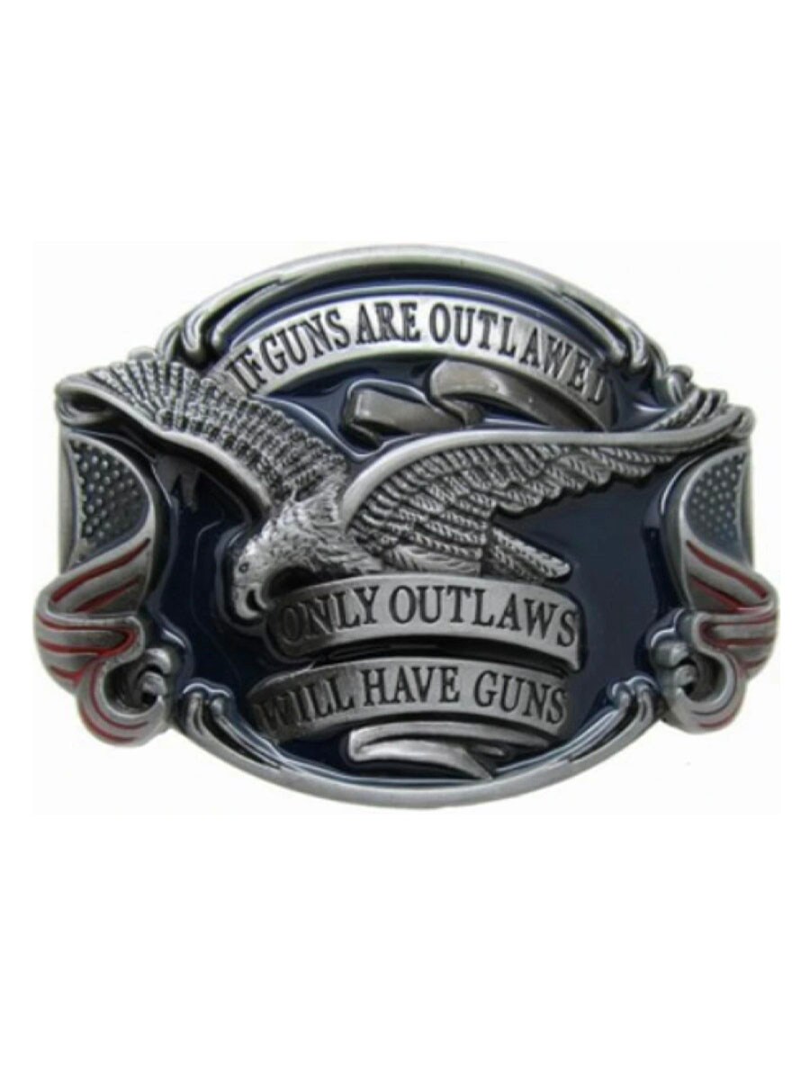A detailed buckle featuring a flying eagle and the message: “If guns are outlawed, only outlaws will have guns.” The oval shape and patriotic elements give it a strong western look. The buckle fits belts up to 4 cm wide, making it easy to pair with most standard belts with interchangeable buckles.