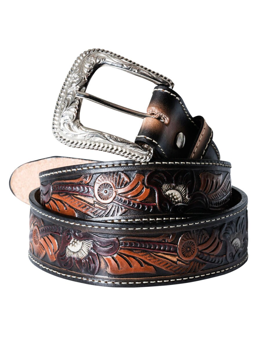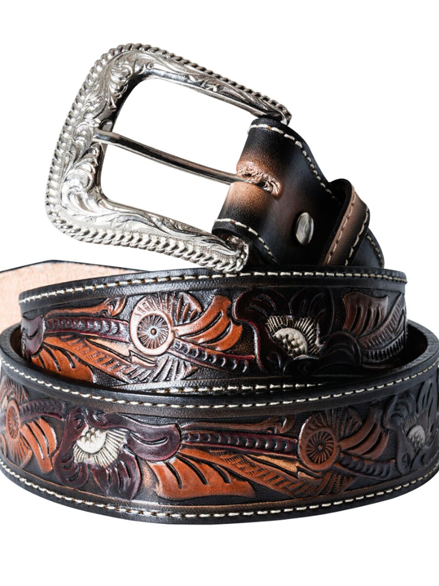 A stylish western belt made from thick cowhide, featuring a decorative embossed pattern and contrast stitching that give it a classic and refined look. The stylish buckle is interchangeable, making it easy to pair the belt with almost any buckle.
