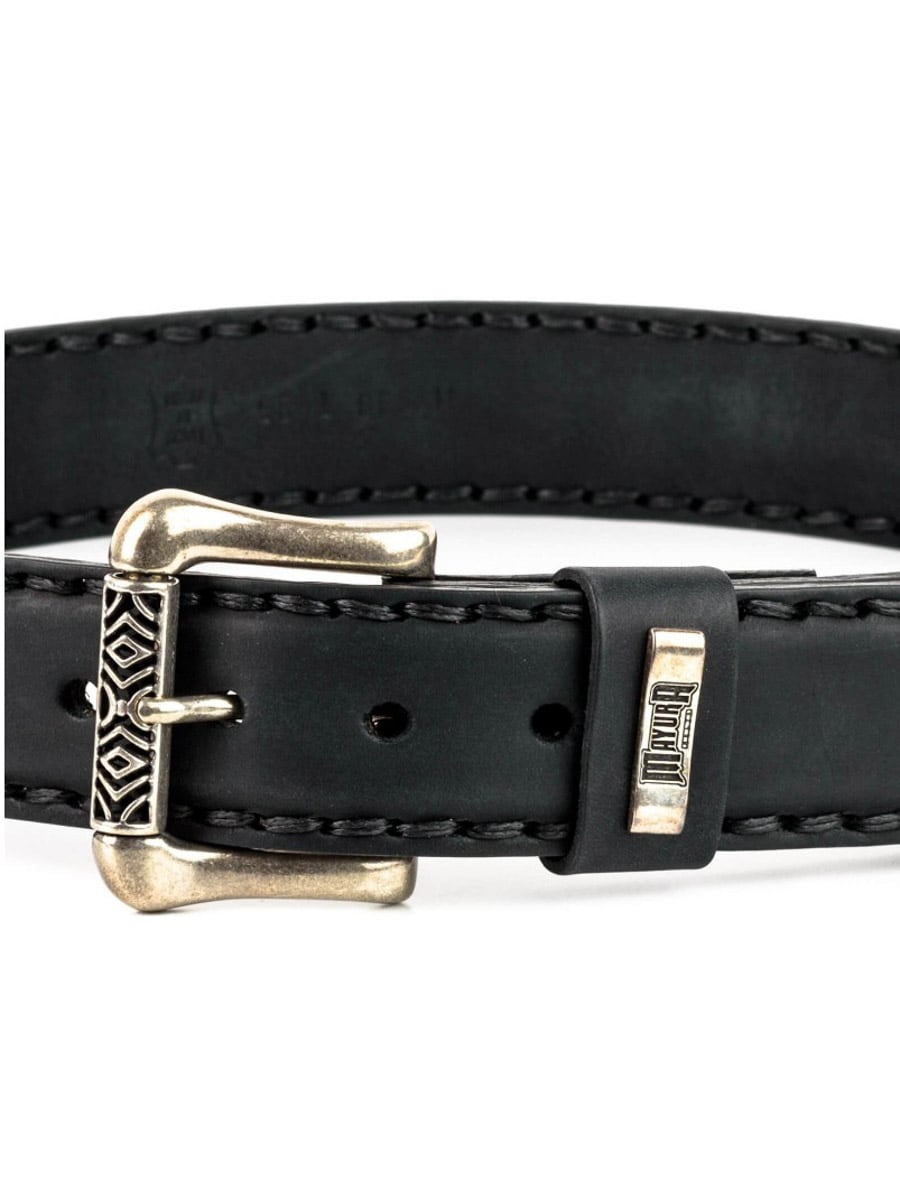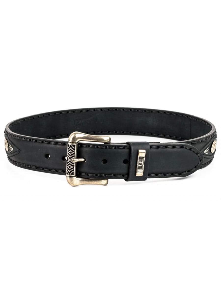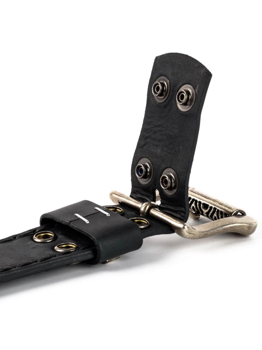 A powerful and stylish belt with a clear western character. Crafted from durable black leather and decorated with embossed patterns and antique-finished metal details, giving it a distinctive and exclusive expression. A perfect accessory for adding a personal and rugged edge to your outfit!