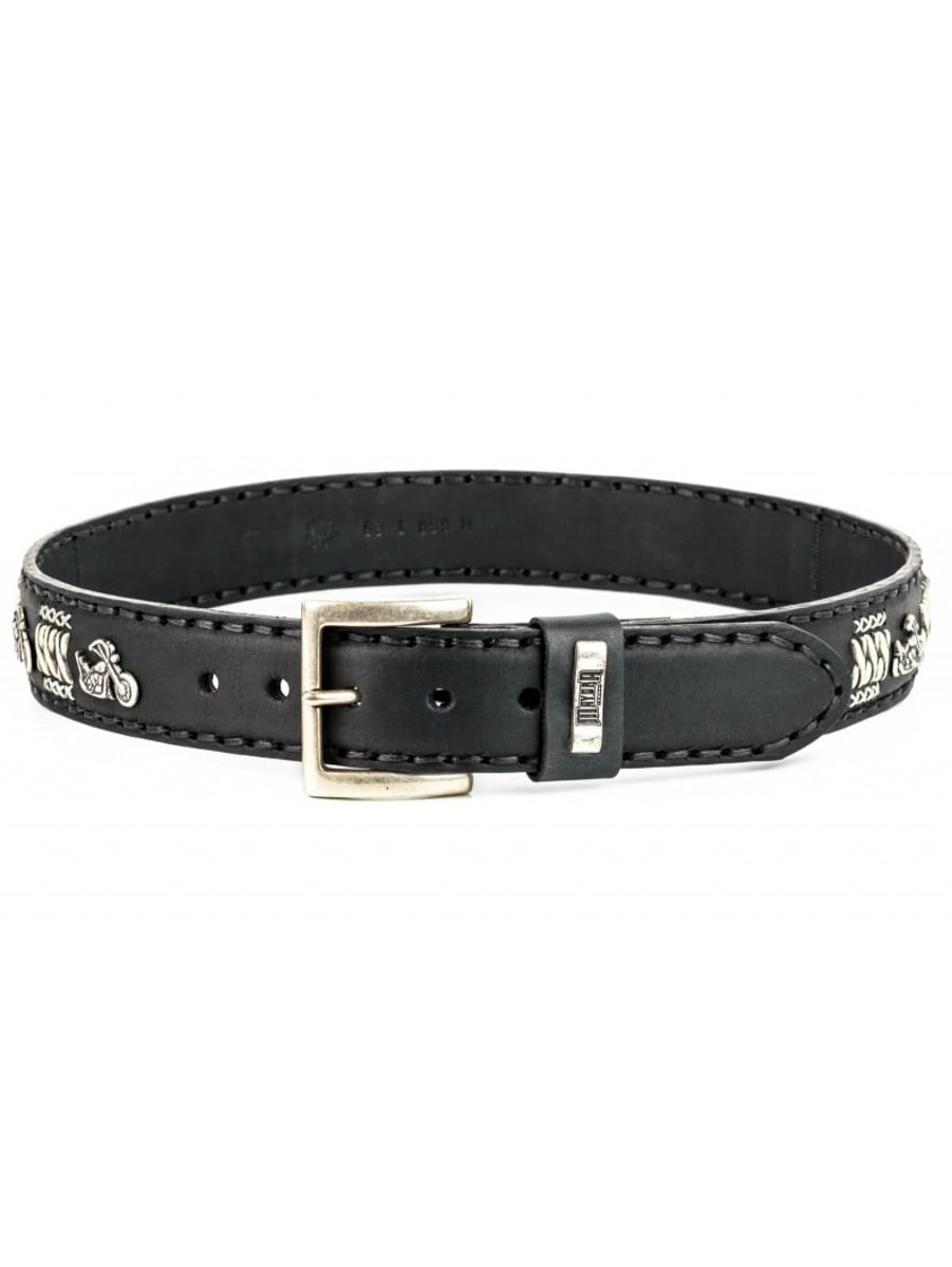 A tough and character-rich belt created for those who appreciate a raw and personal style. Made from genuine cow leather and decorated with detailed metal elements shaped like motorcycles and cross motifs, giving it a strong biker look. The antique-finished metal buckle completes the design and makes the belt a perfect accessory for jeans and boots.