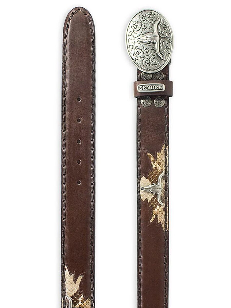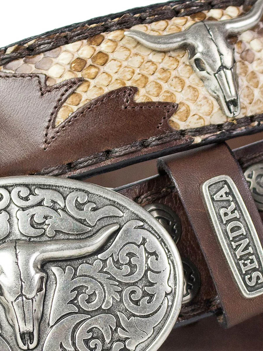 A premium belt for those who want a strong western expression with a luxurious finish. Crafted from high-quality brown leather and decorated with natural python leather inlays that create a unique texture and character. The detailed metal decorations and the oval buckle featuring a longhorn motif enhance the rustic cowboy style that Sendra is known for. A perfect complement to both jeans and cowboy boots!