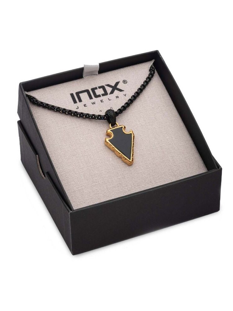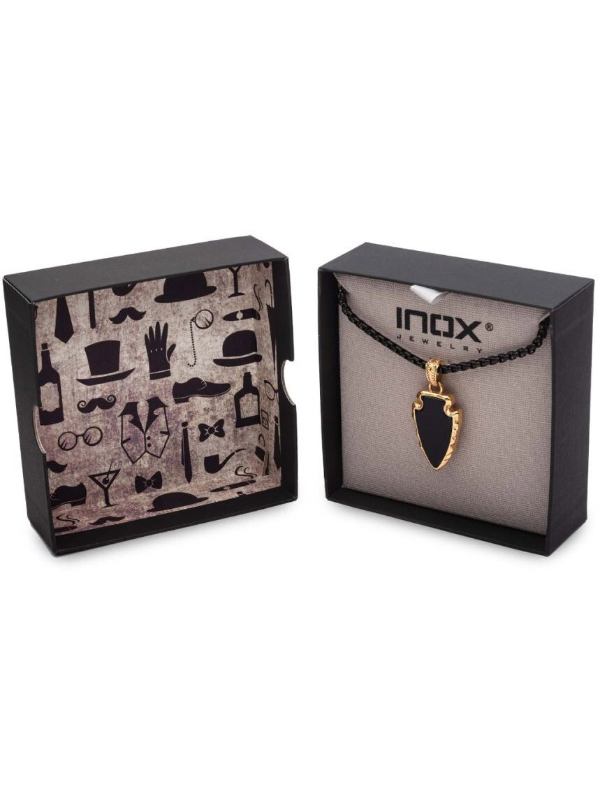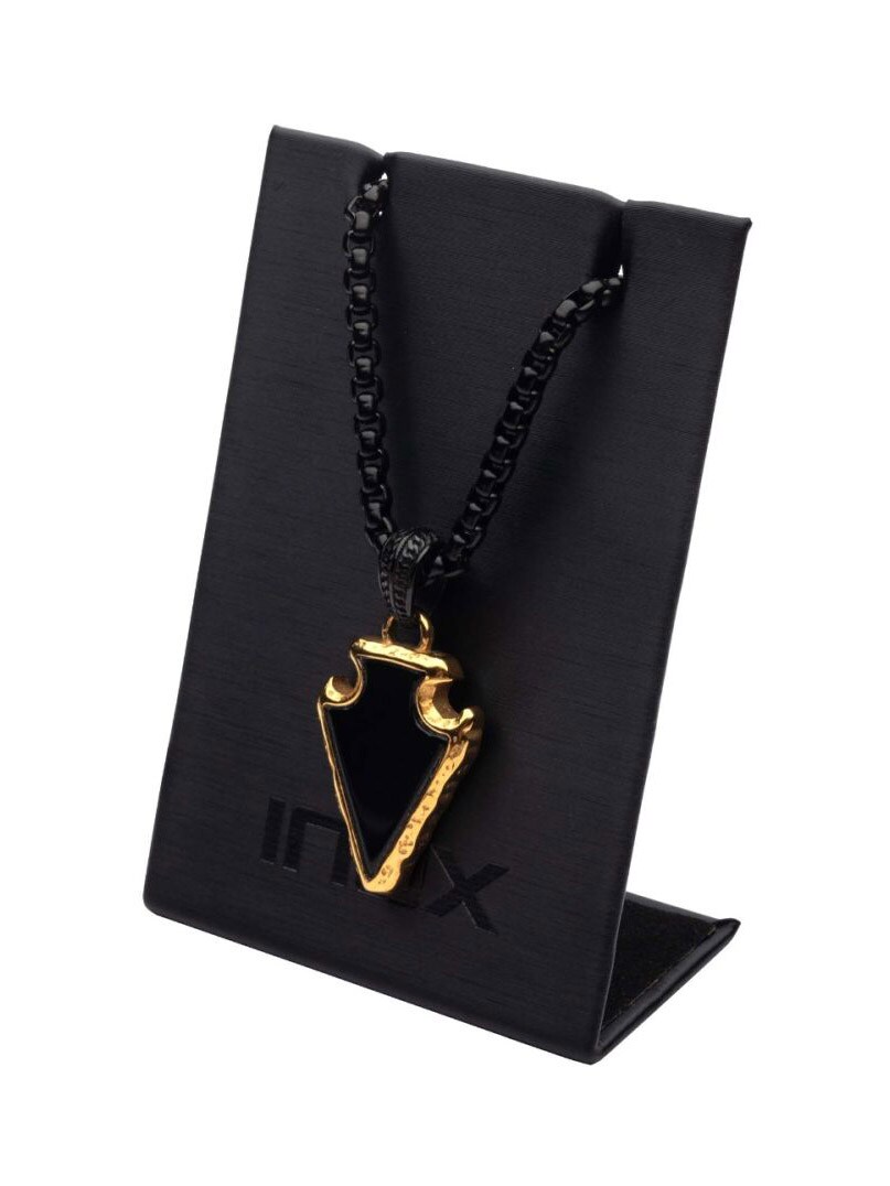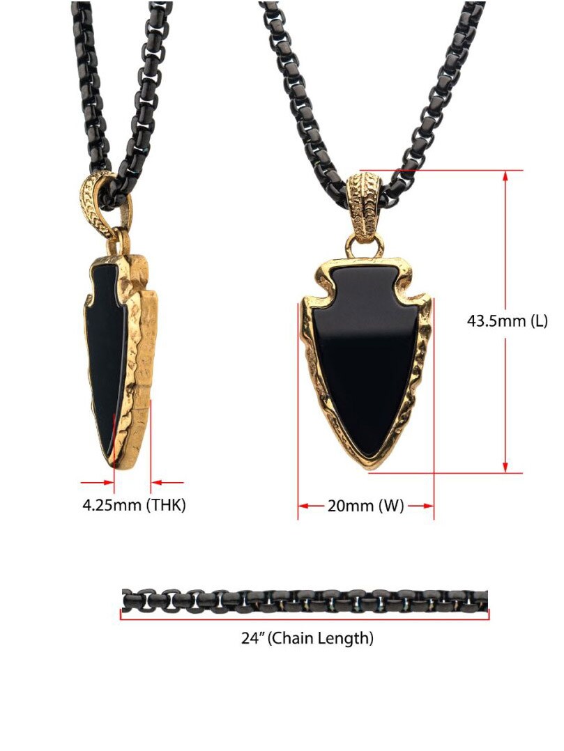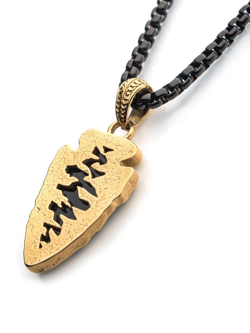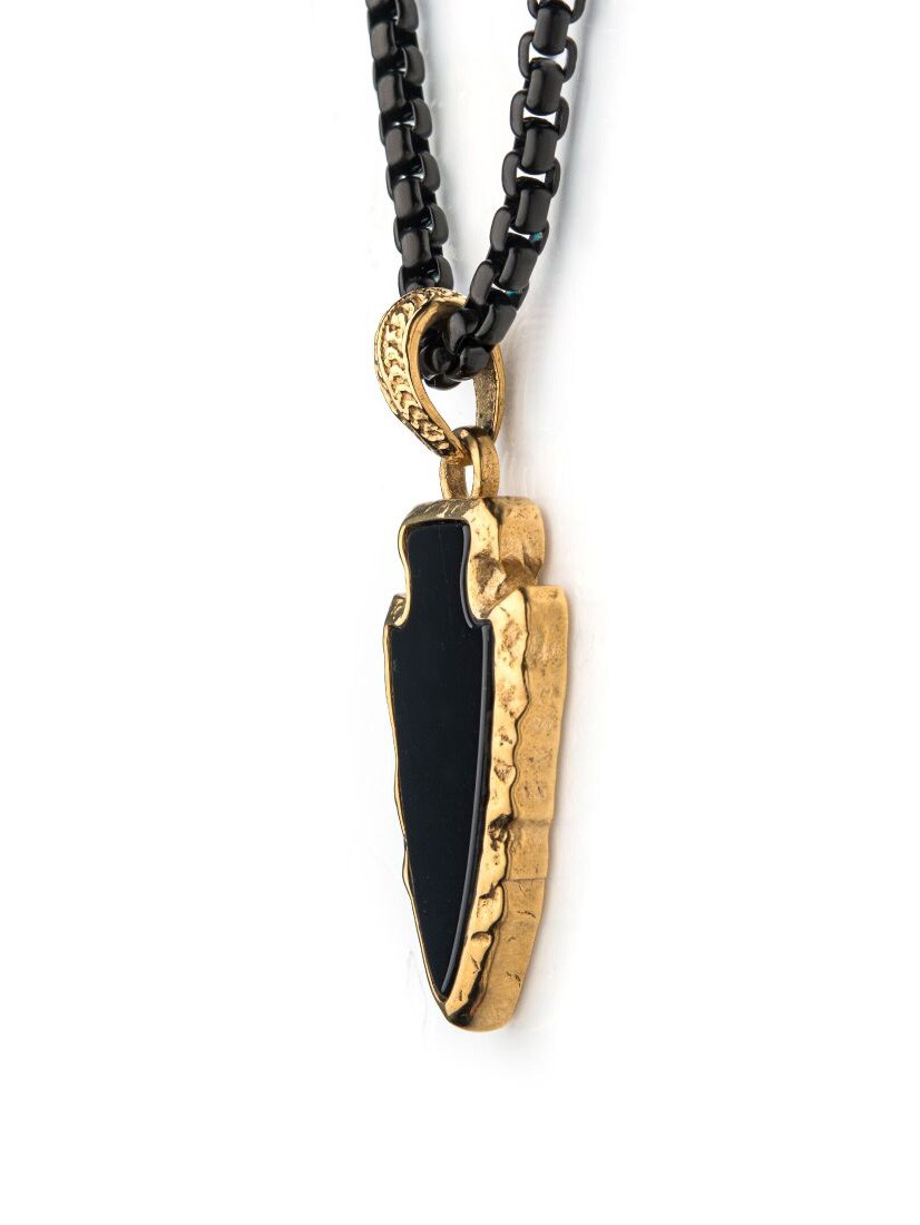 Necklace with polished box link in black IP steel. The pendant is shaped like an arrowhead and consists of black agate stone set in a robust frame of gold plating.