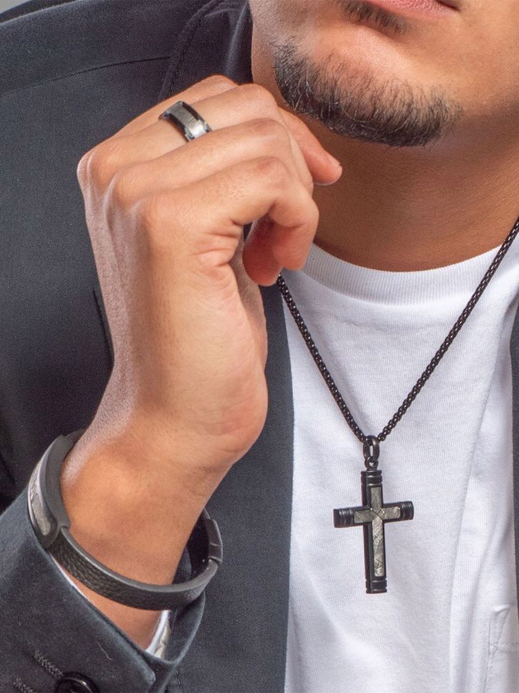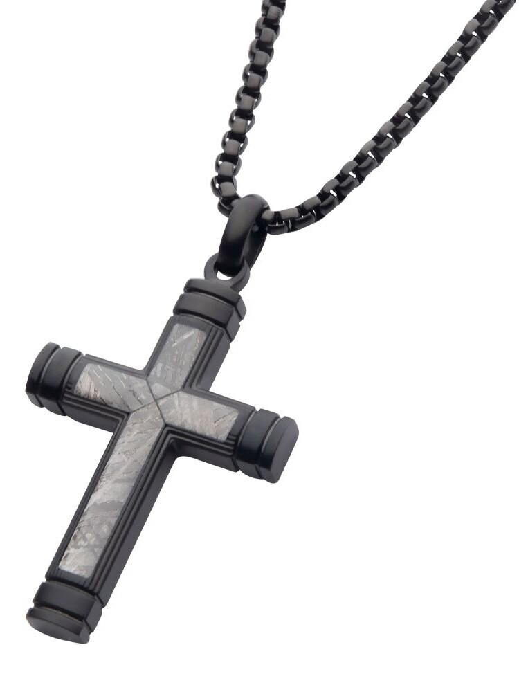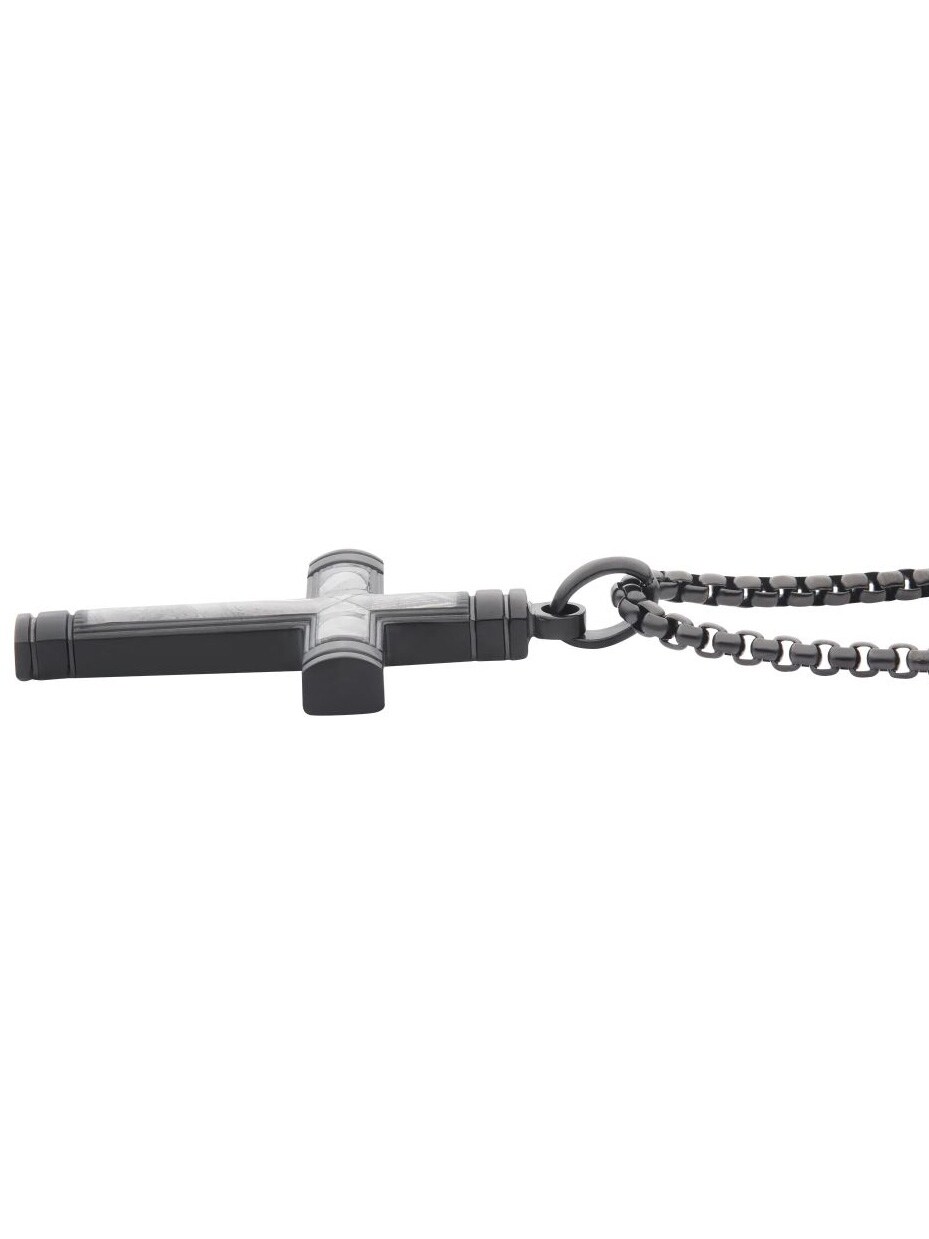 Necklace with black IP plating and a pendant with meteorite inlay. Made of stainless steel.