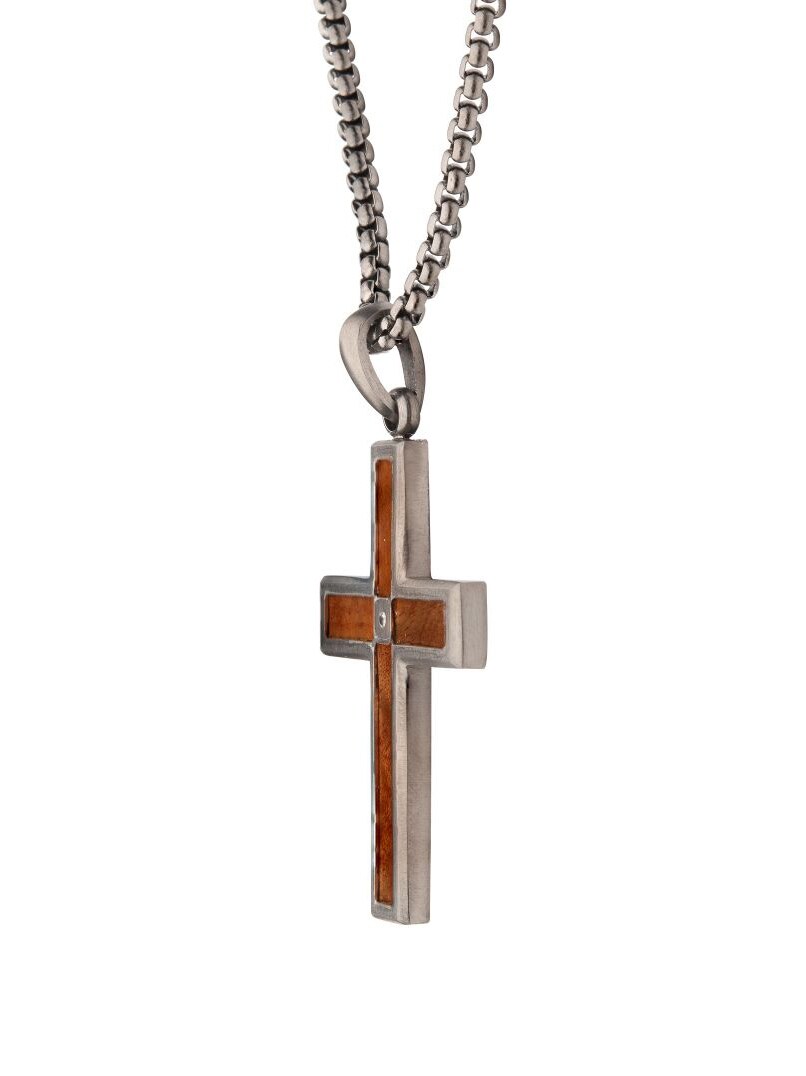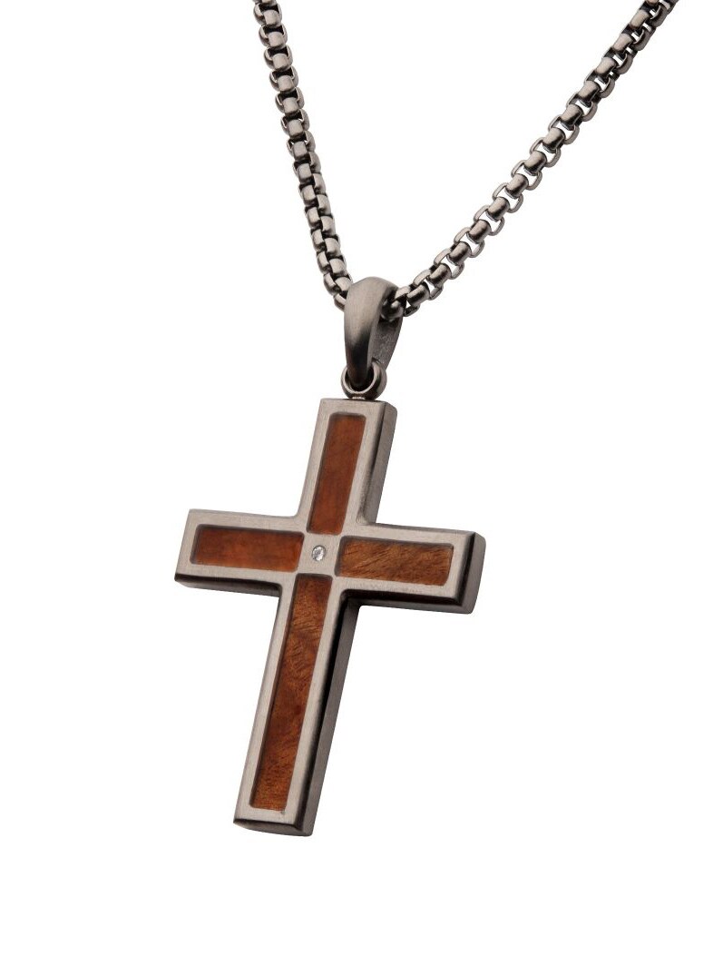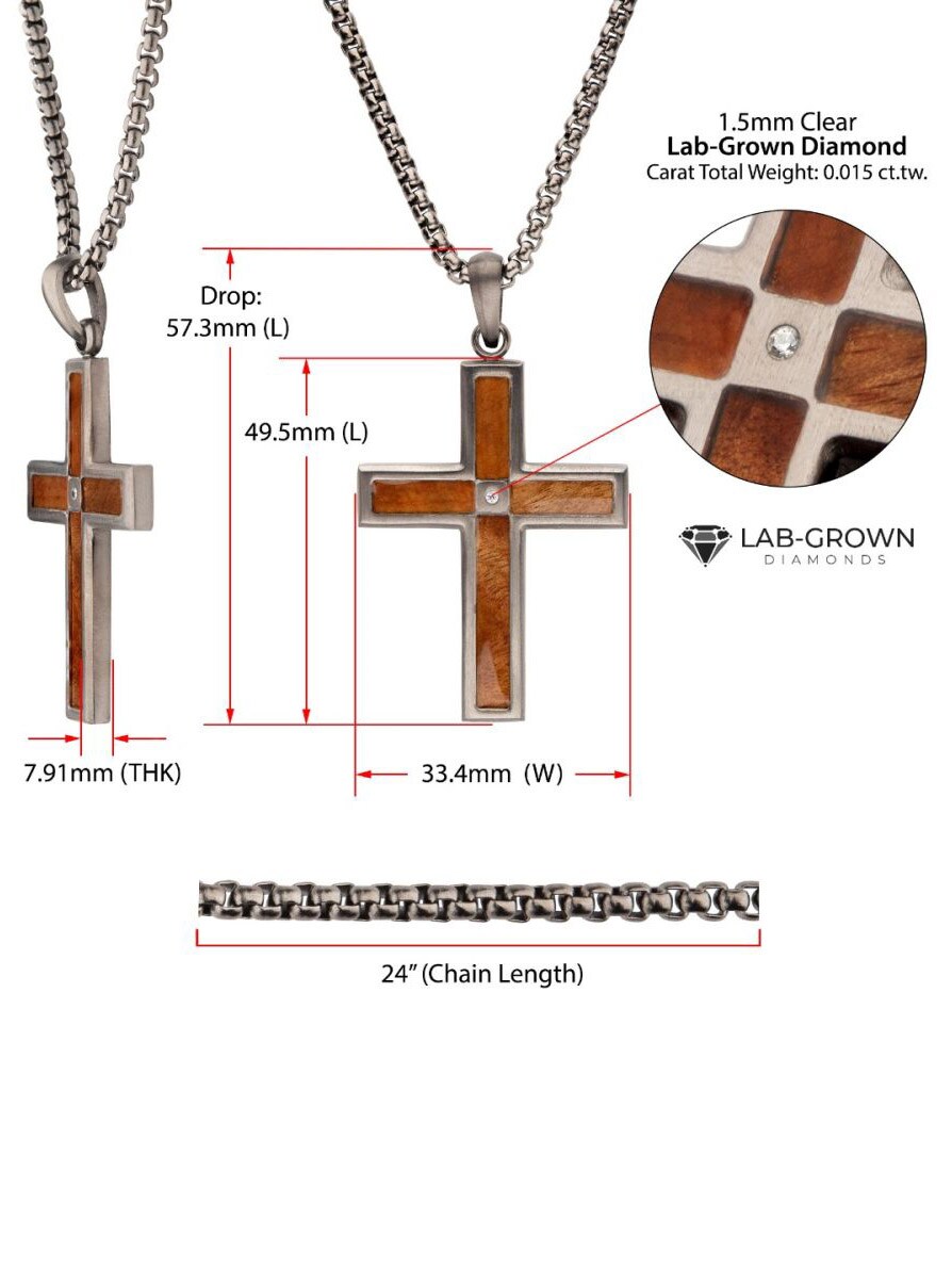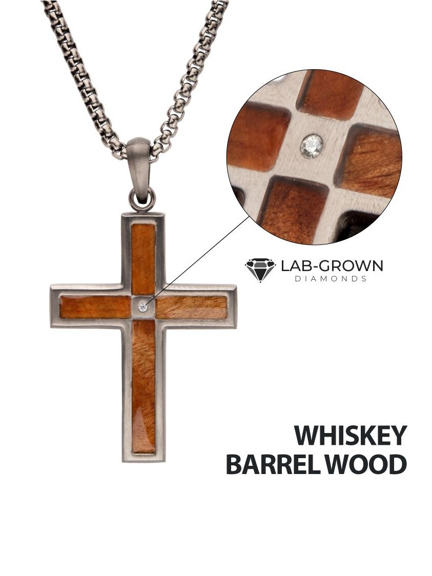 Men's Cross Pendant – Gun Metal IP Steel with Whiskey Barrel Wood Inlay and Lab-Grown Diamond