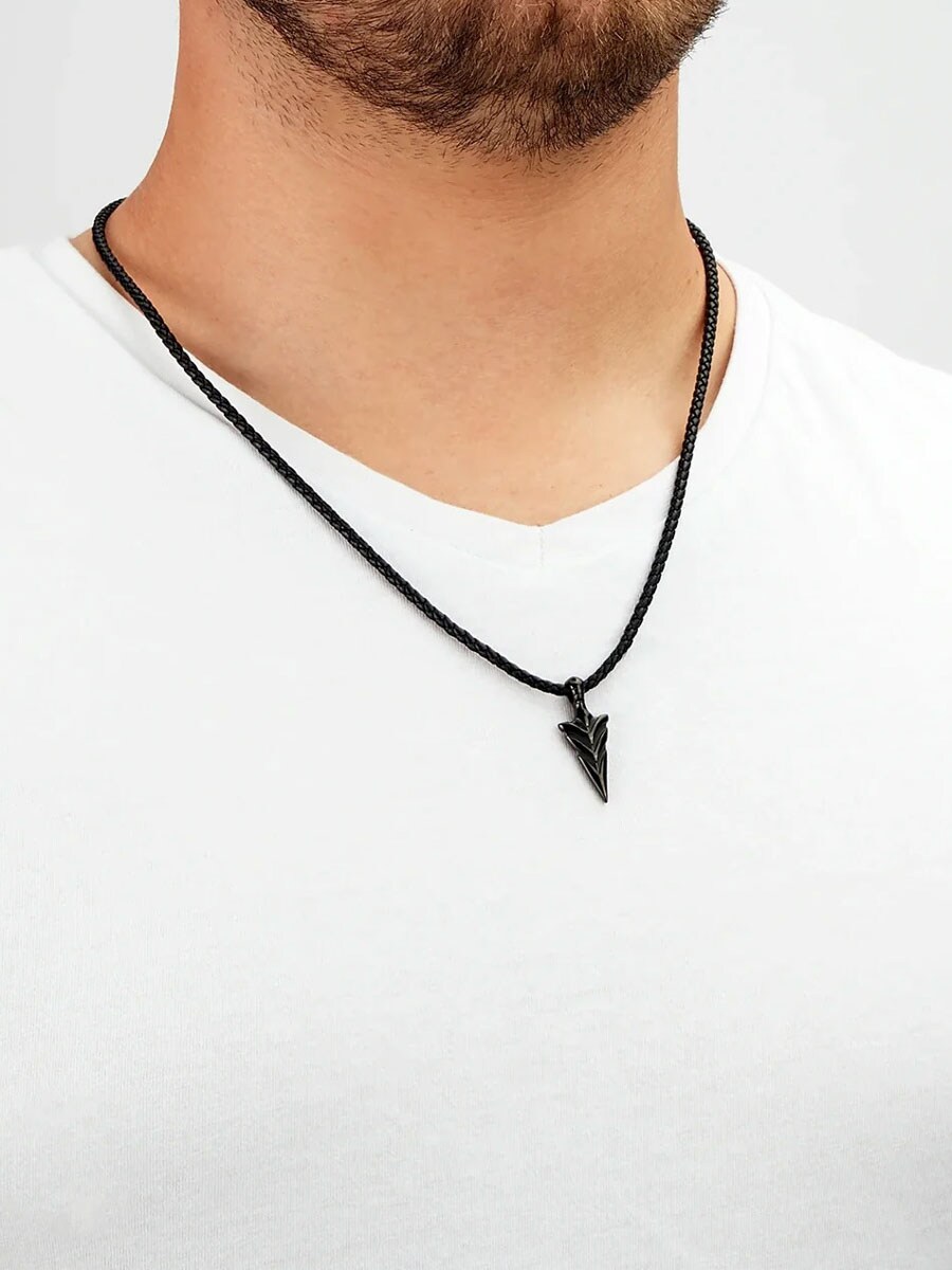 A sleek necklace featuring braided black leather and an elegant arrow pendant in polished stainless steel. It closes smoothly with a twist lock that stays secure without creating pressure points. The leather cord is also slim enough to add other pendants – perfect if you enjoy varying your style. A comfortable and timeless accessory for any occasion.