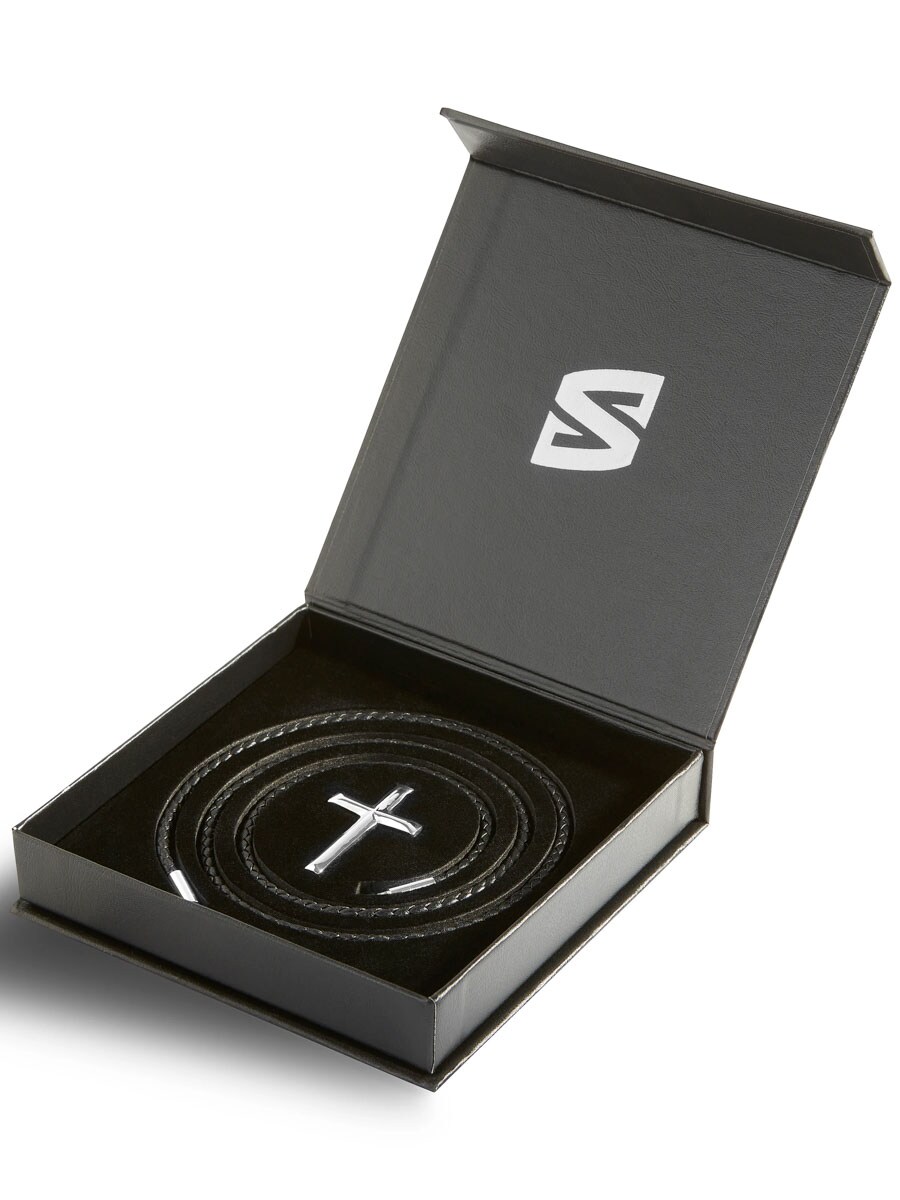 A sleek necklace featuring braided black leather and an elegant cross pendant in polished stainless steel. It closes smoothly with a twist lock that stays secure without creating pressure points. The leather cord is also slim enough for adding other pendants, making it perfect if you like to vary your style. A comfortable and timeless accessory for any occasion.