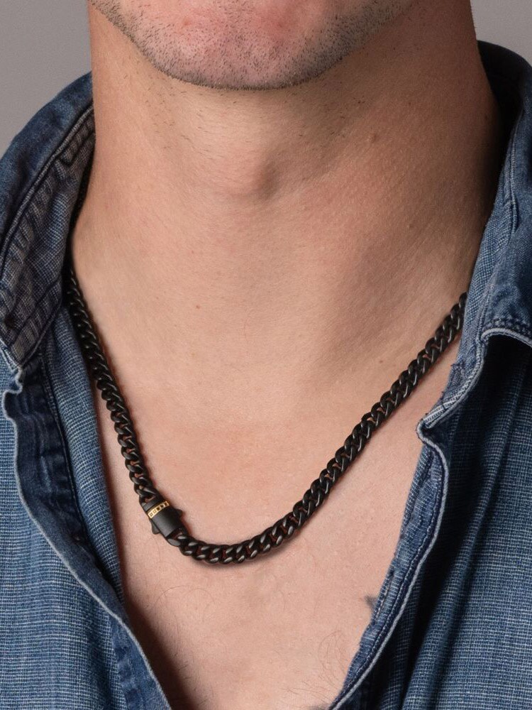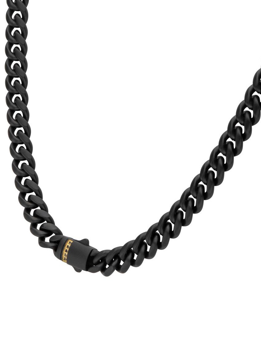 Cuban chain from Inox with black IP plating and matte finish. The clasp is adorned with black sapphire stones set in an exclusive 18K gold-plated double folding clasp that provides both security and a luxurious detail.