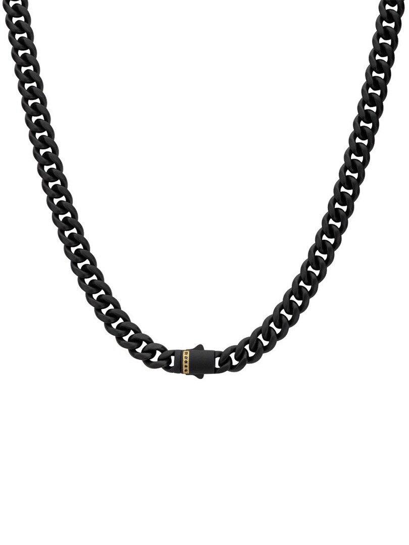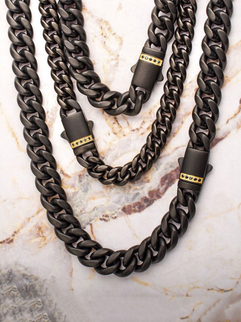 Cuban chain from Inox with black IP plating and matte finish. The clasp is adorned with black sapphire stones set in an exclusive 18K gold-plated double folding clasp that provides both security and a luxurious detail.