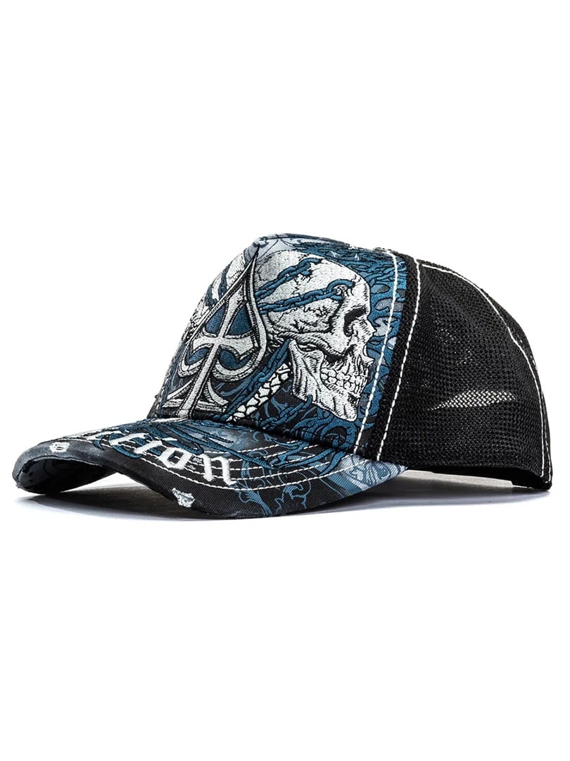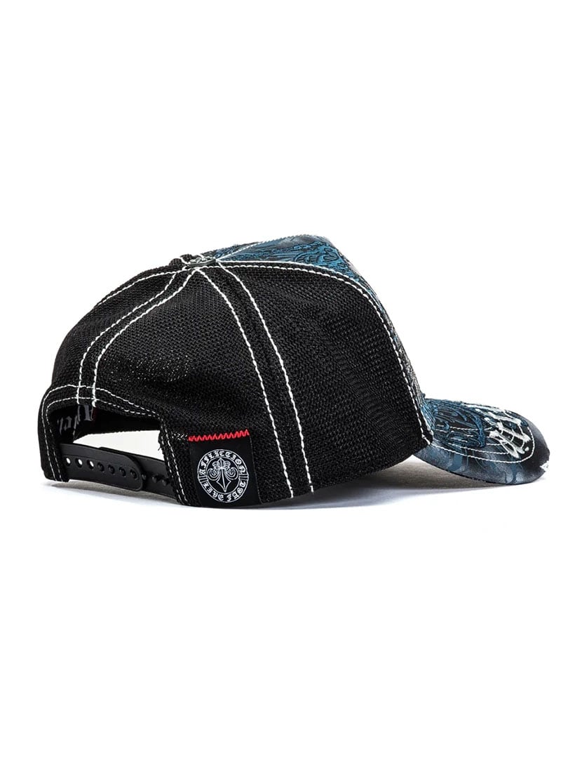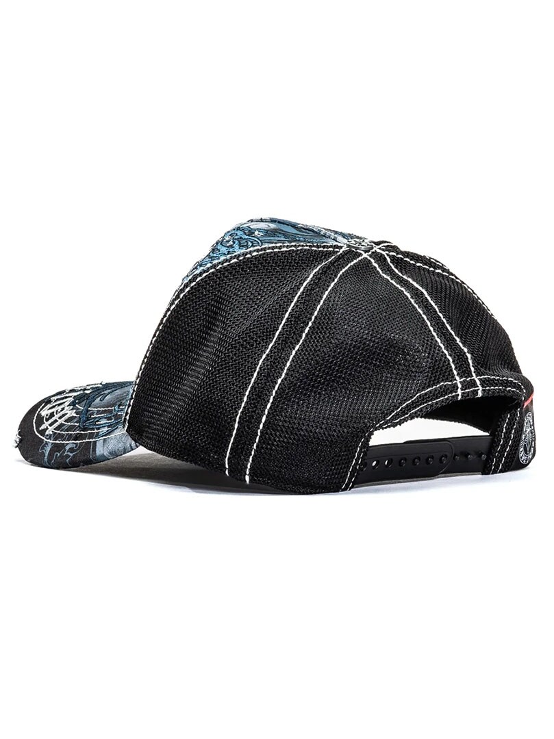 A trucker cap with a powerful and detailed look in Affliction’s signature style. The cap features twill on the front panels and visor, with mesh at the back for good ventilation. Distressed details on the front and brim combined with contrasting stitching create a raw, rock-inspired look. The snapback closure at the back provides an adjustable and comfortable fit for everyday wear.