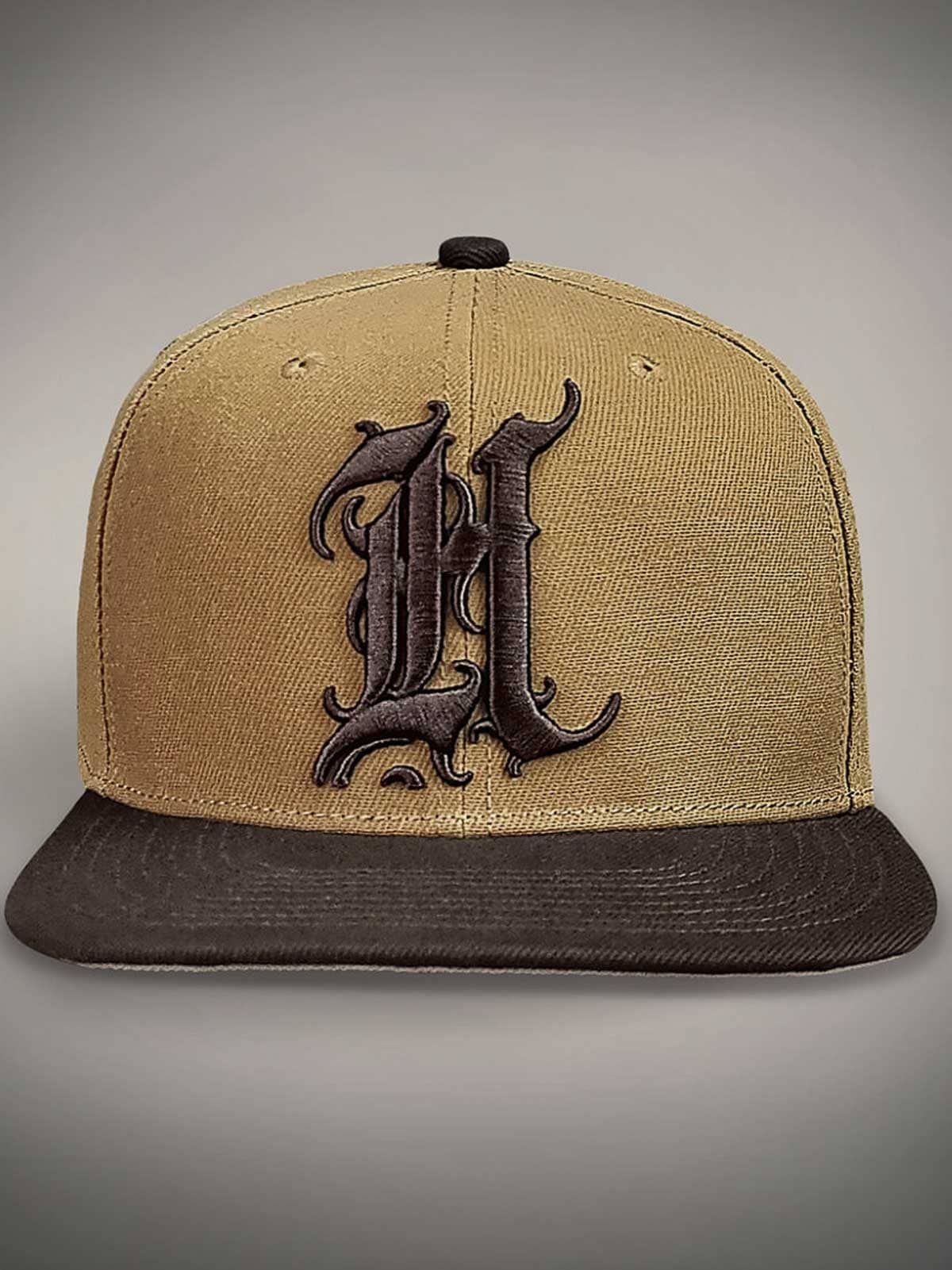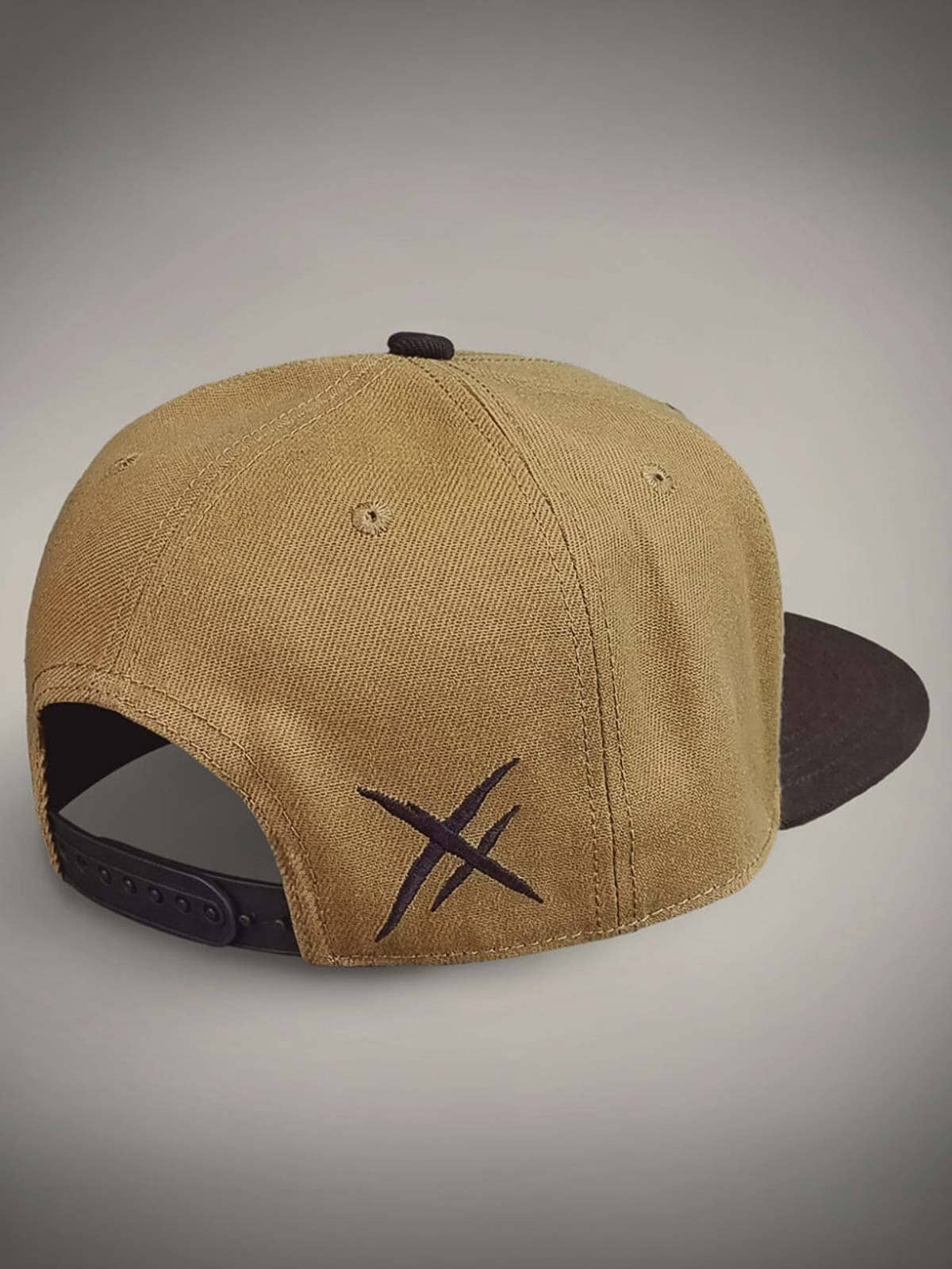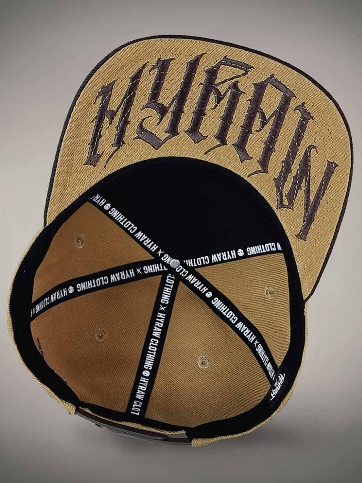 Camel-colored cap with a flat brown brim, decorated with an embroidered logo on the front. The underside of the brim features a brown, custom embroidered logo, and the cap has an adjustable snapback for a comfortable fit.