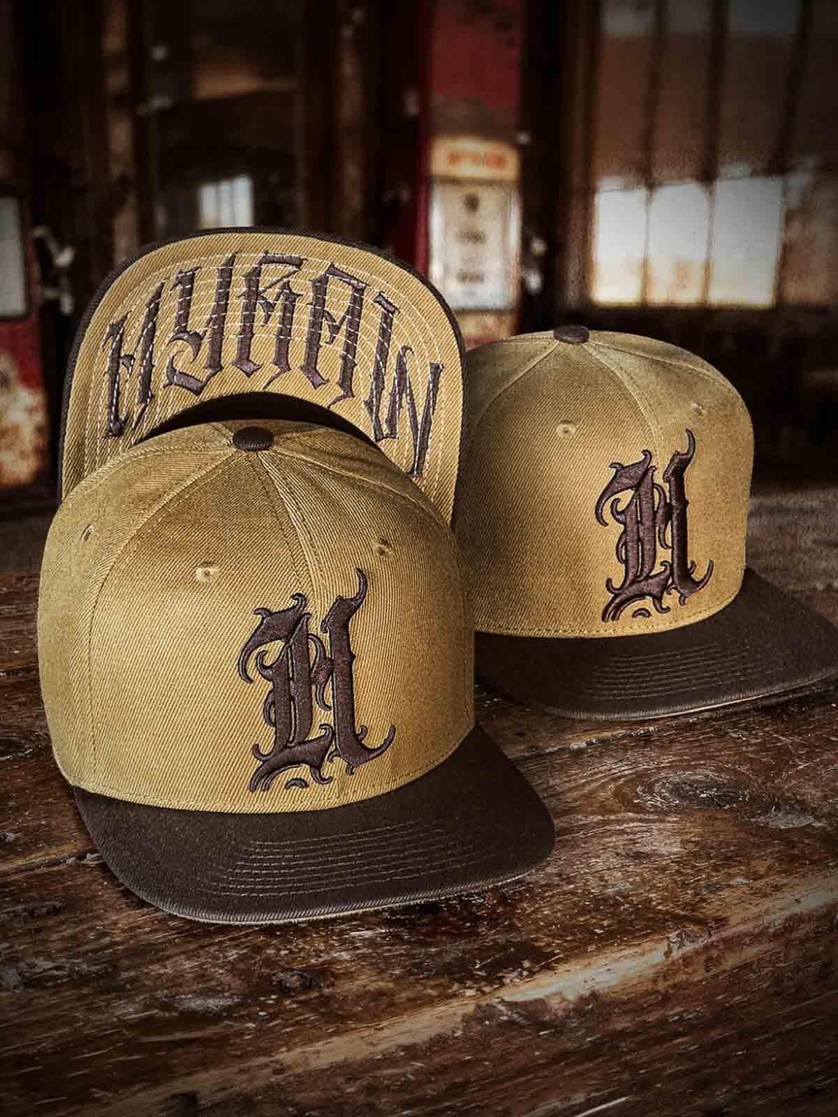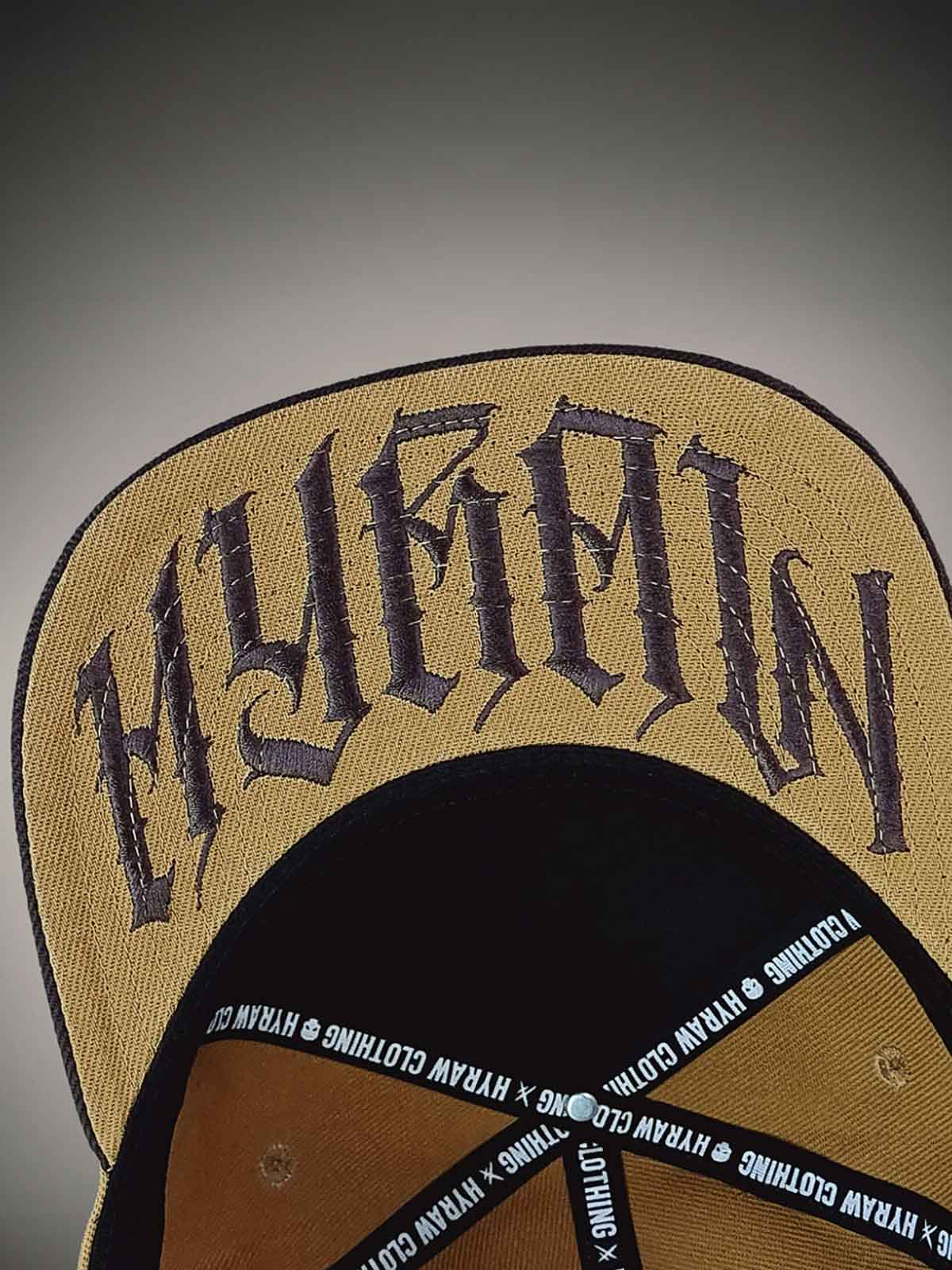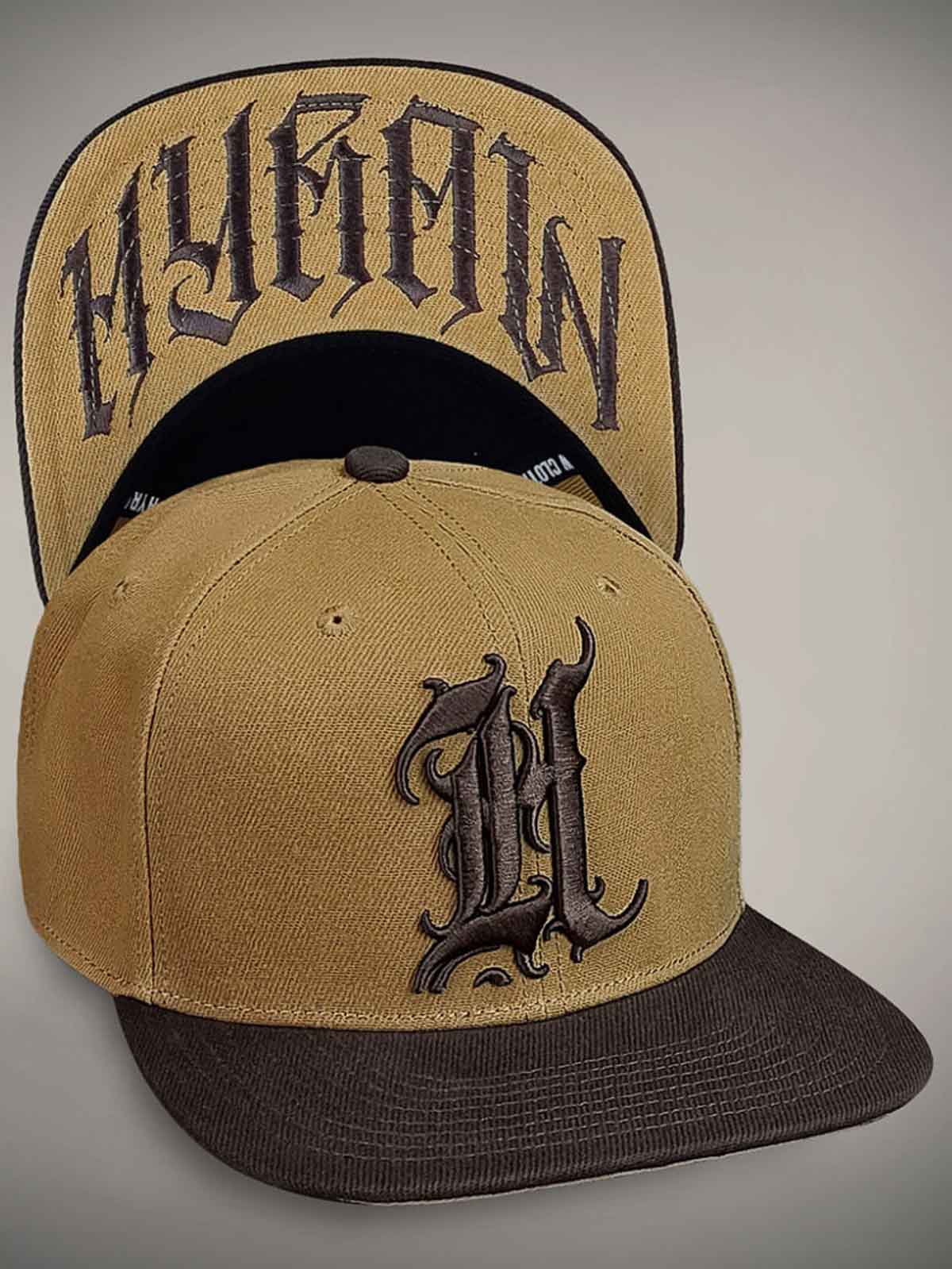 Camel-colored cap with a flat brown brim, decorated with an embroidered logo on the front. The underside of the brim features a brown, custom embroidered logo, and the cap has an adjustable snapback for a comfortable fit.