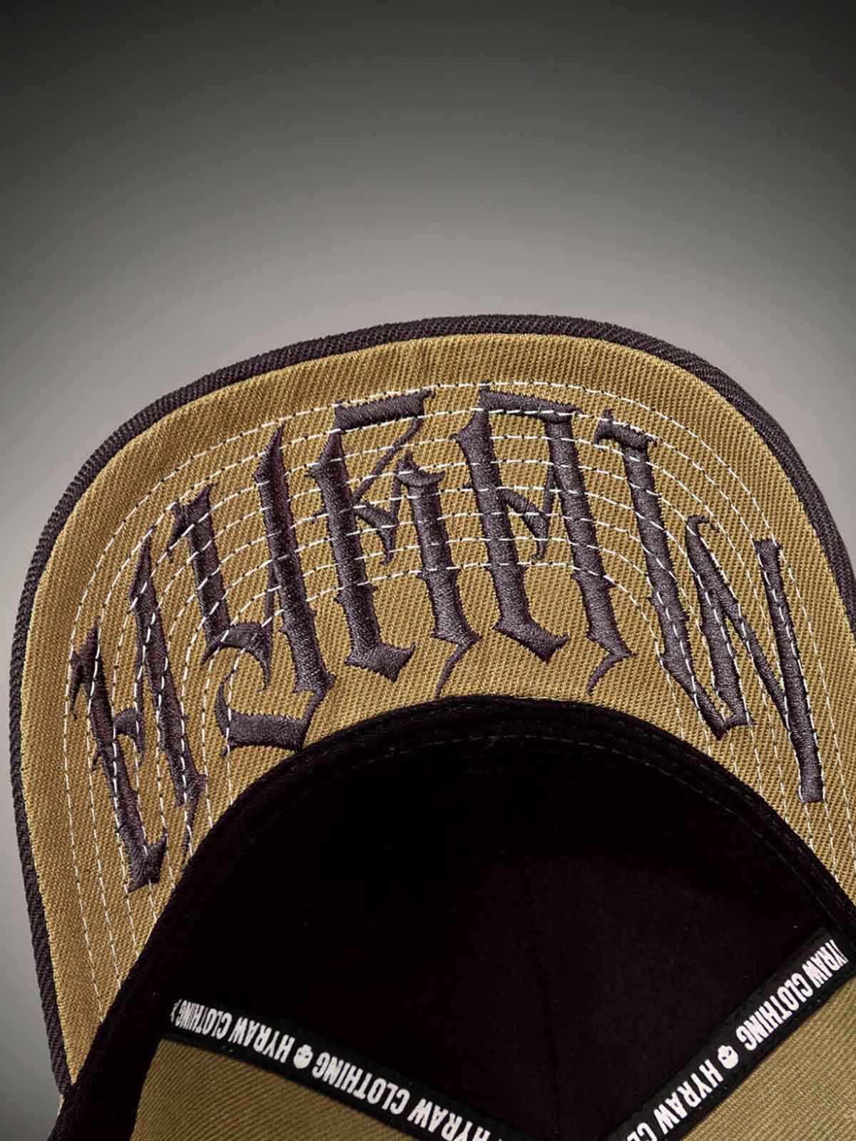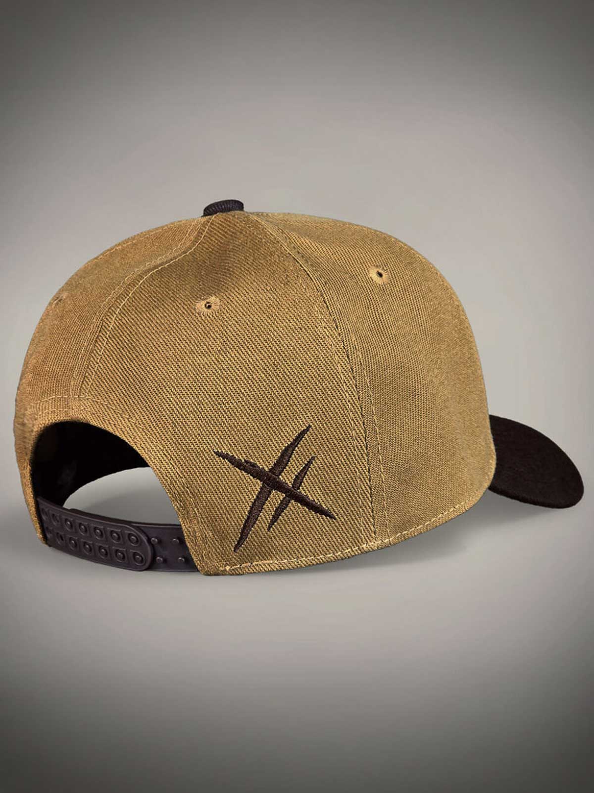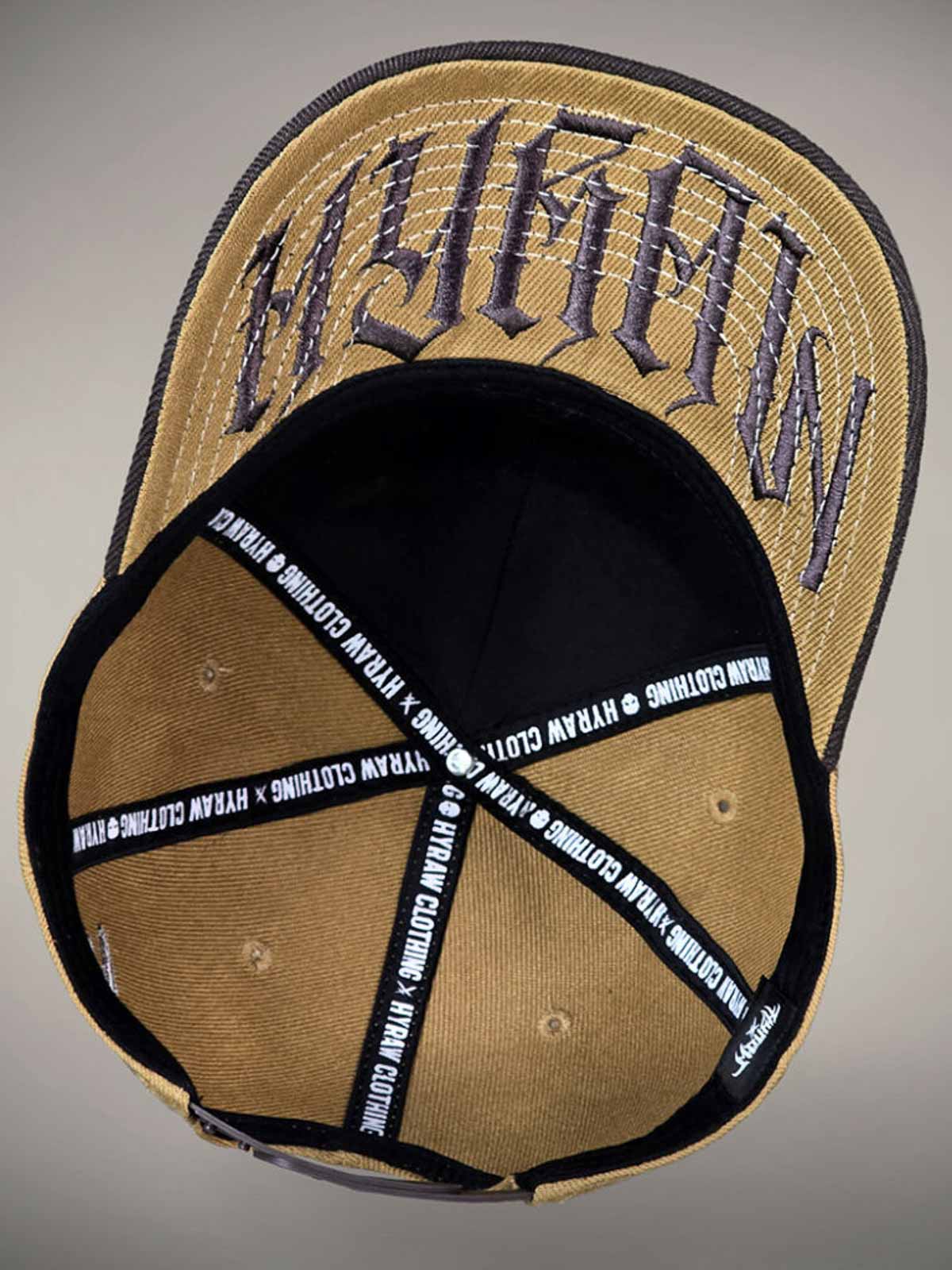 Camel-colored cap with a curved brown brim, decorated with an embroidered logo on the front. The underside of the brim features a brown, custom embroidered logo, and the cap has an adjustable snapback for a comfortable fit.