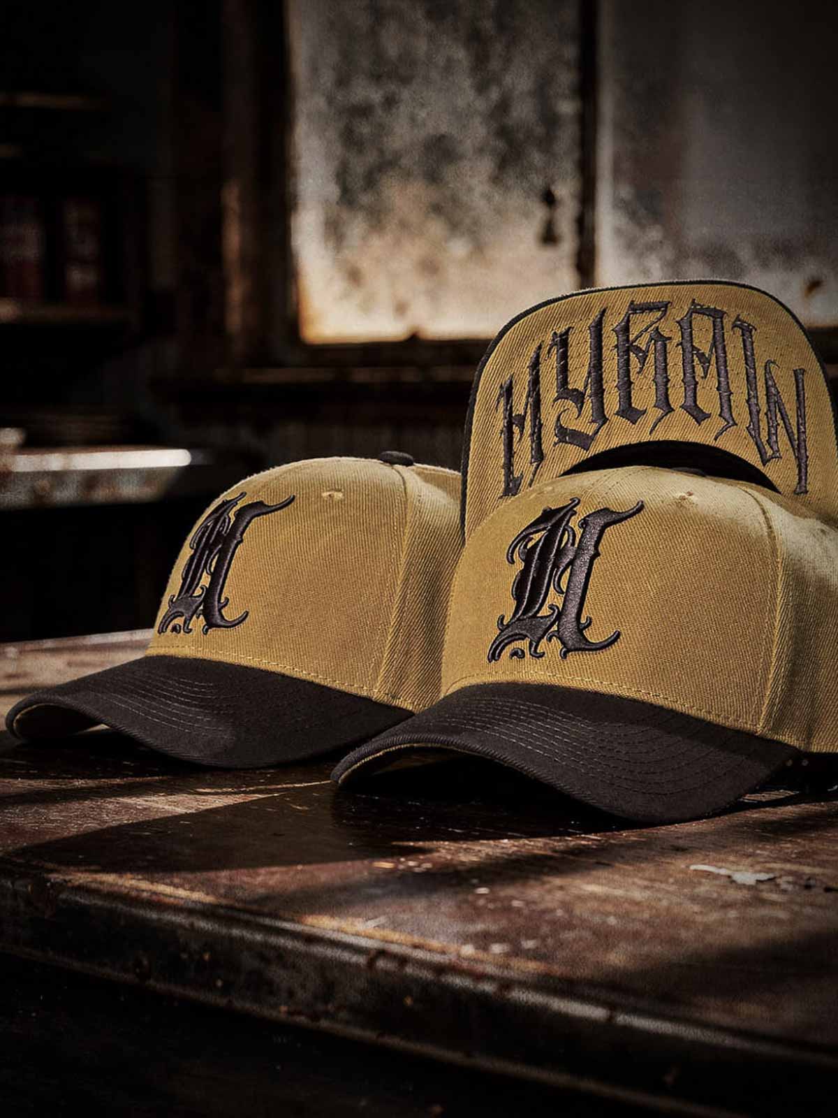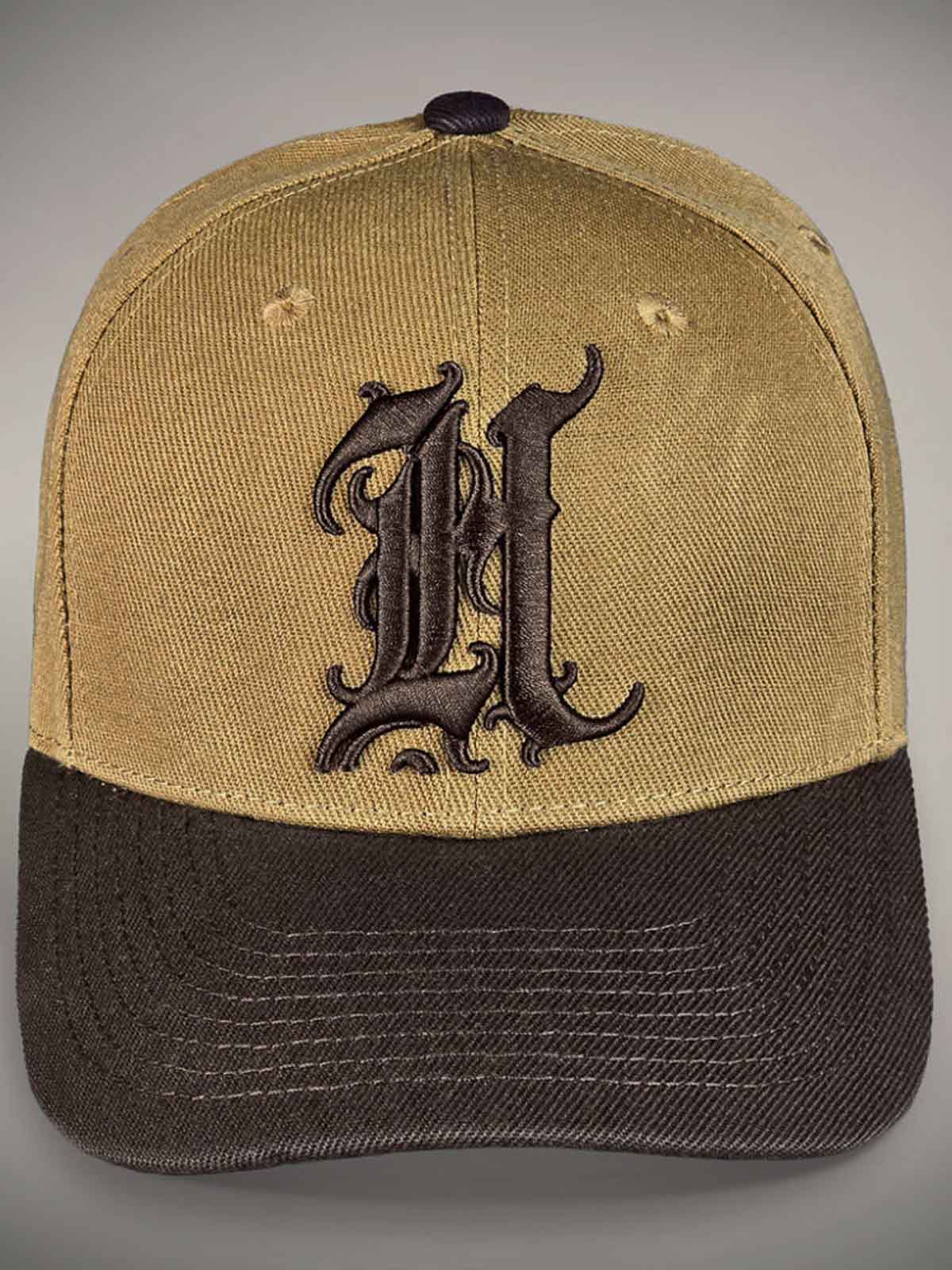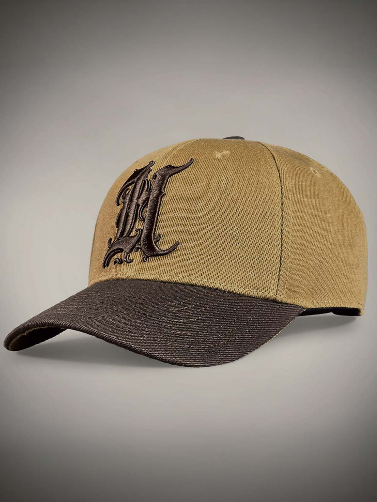 Camel-colored cap with a curved brown brim, decorated with an embroidered logo on the front. The underside of the brim features a brown, custom embroidered logo, and the cap has an adjustable snapback for a comfortable fit.