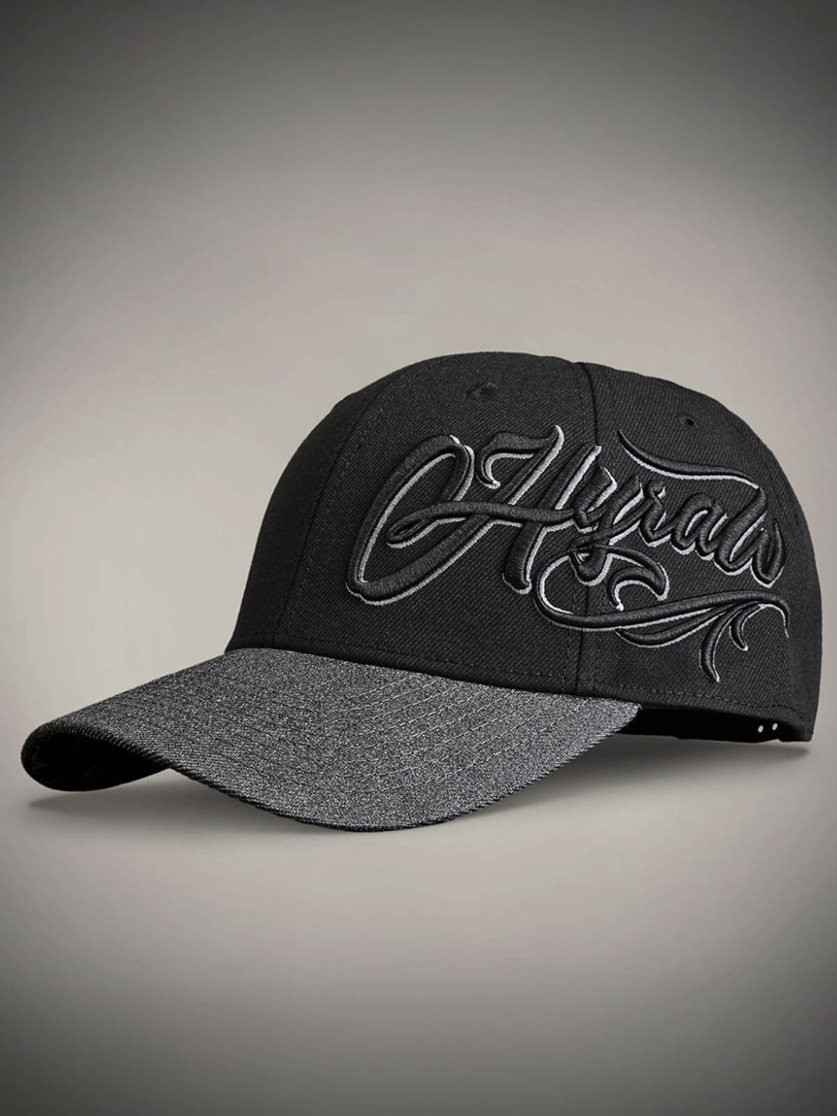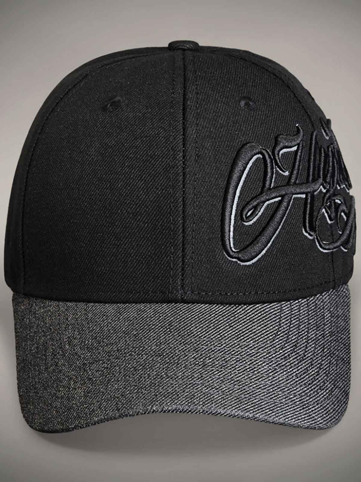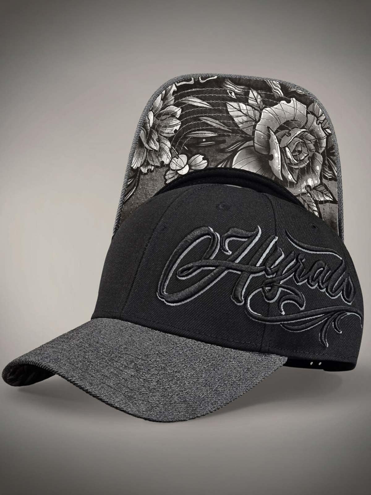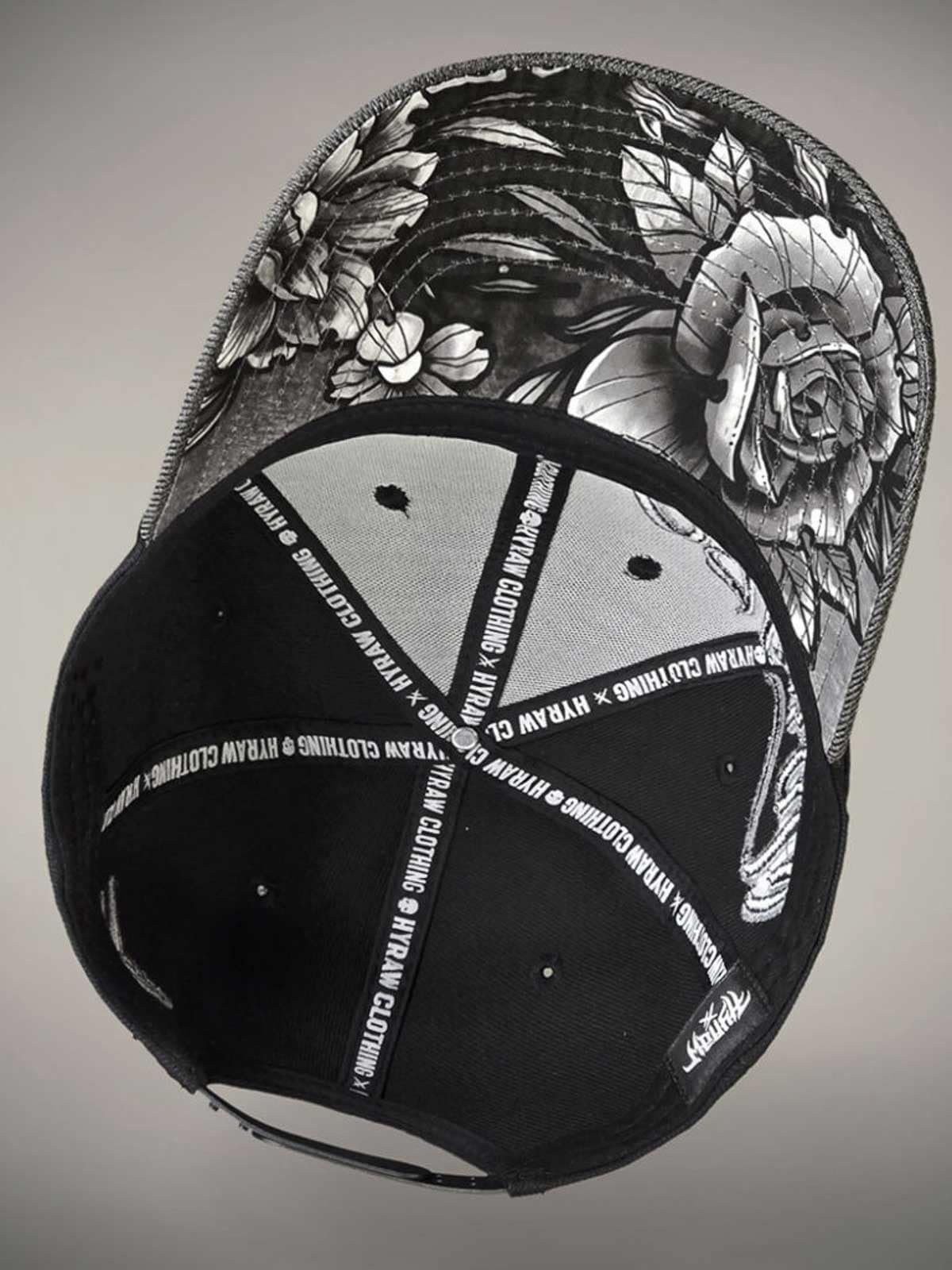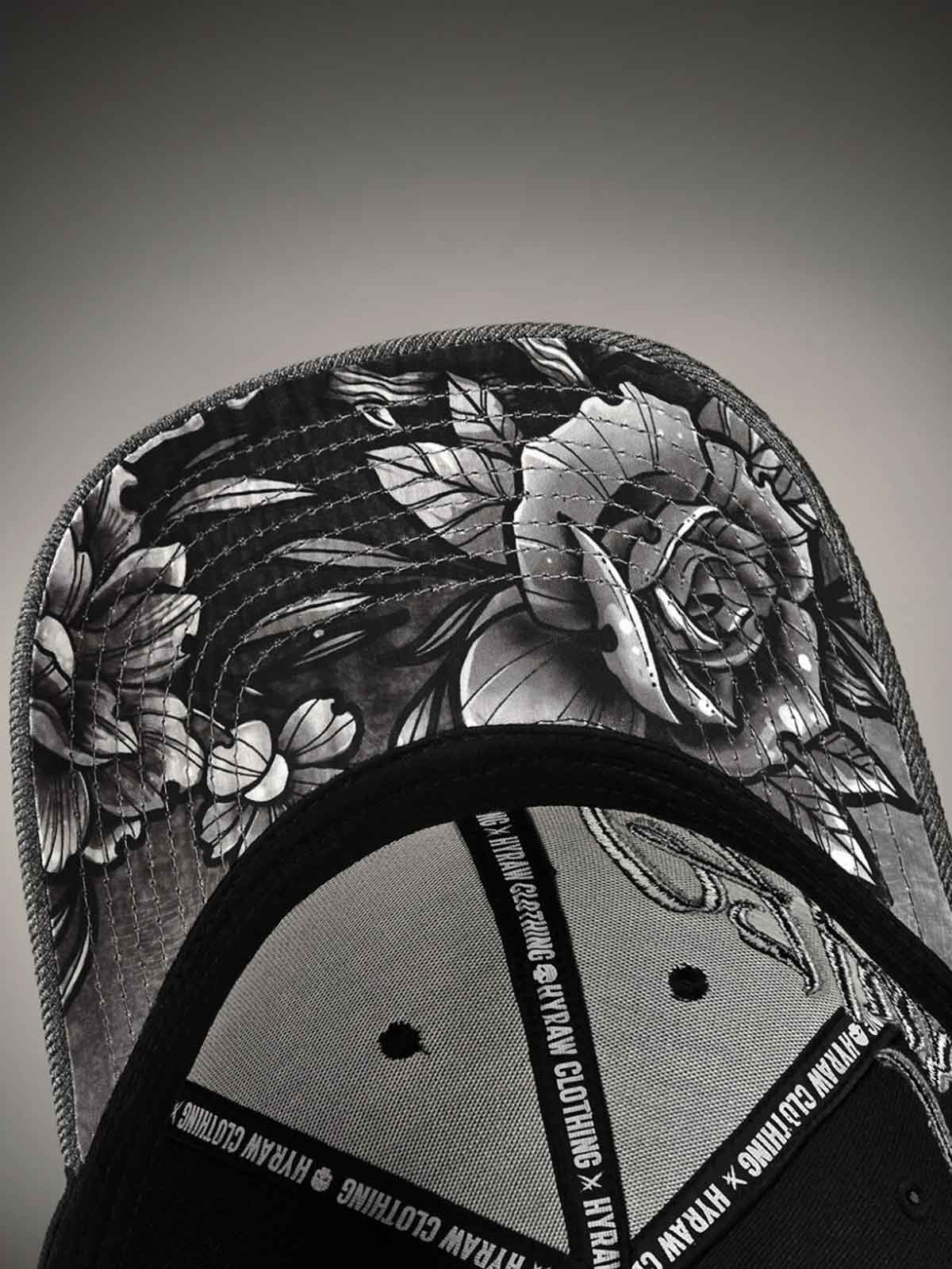 Black cap with a grey curved brim. Designed with an embroidered logo and an adjustable snapback for a perfect fit. The underside of the brim is decorated with a stylish rose motif that gives the cap a unique and eye-catching detail.