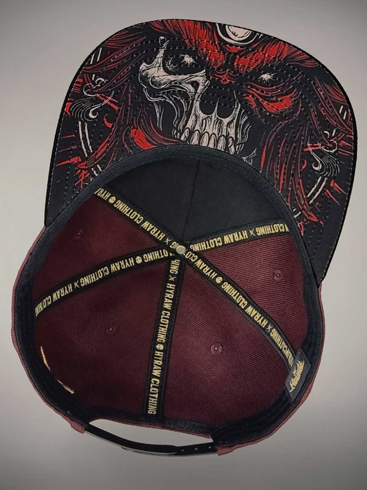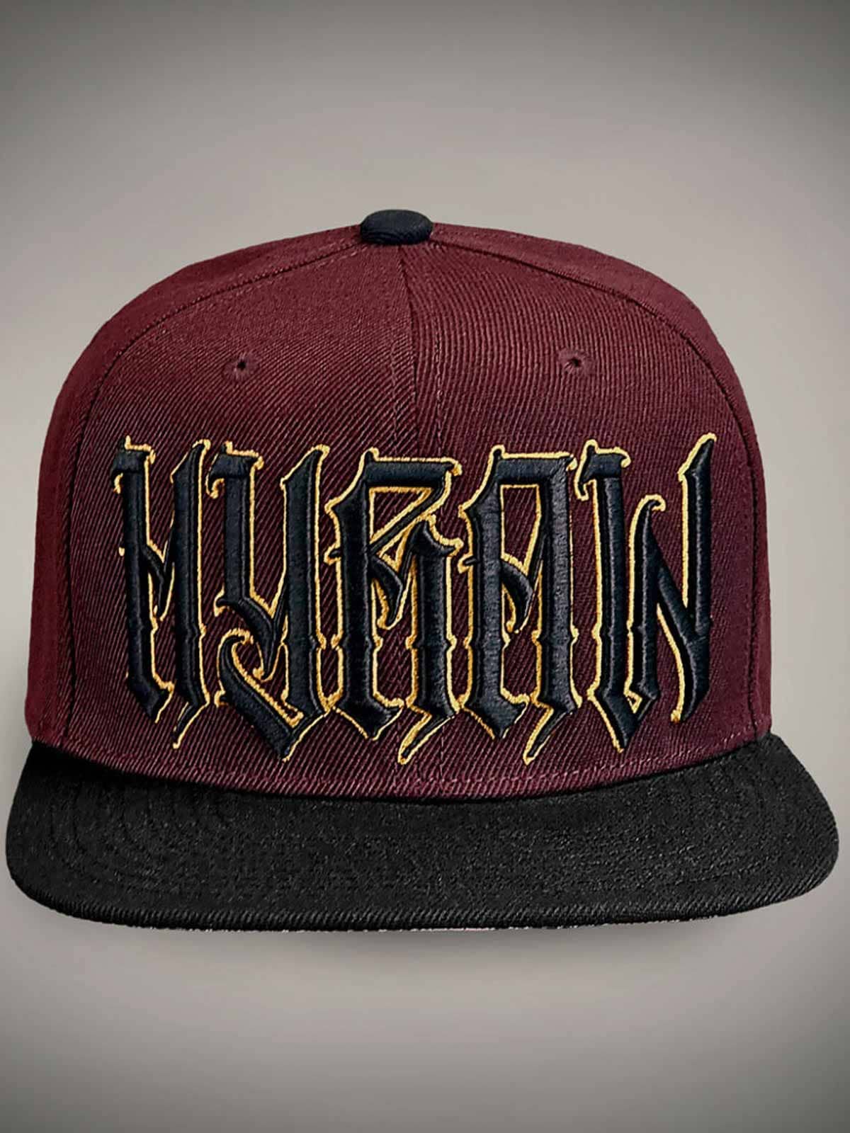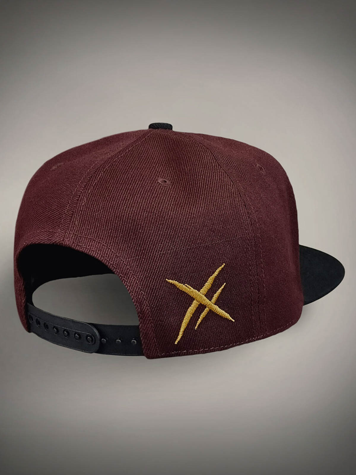 Wine-red cap with a flat brim, decorated with a custom black and yellow logo on the front and a yellow embroidered motif at the back. The underside of the brim features a unique design, giving the cap an extra eye-catching detail.
