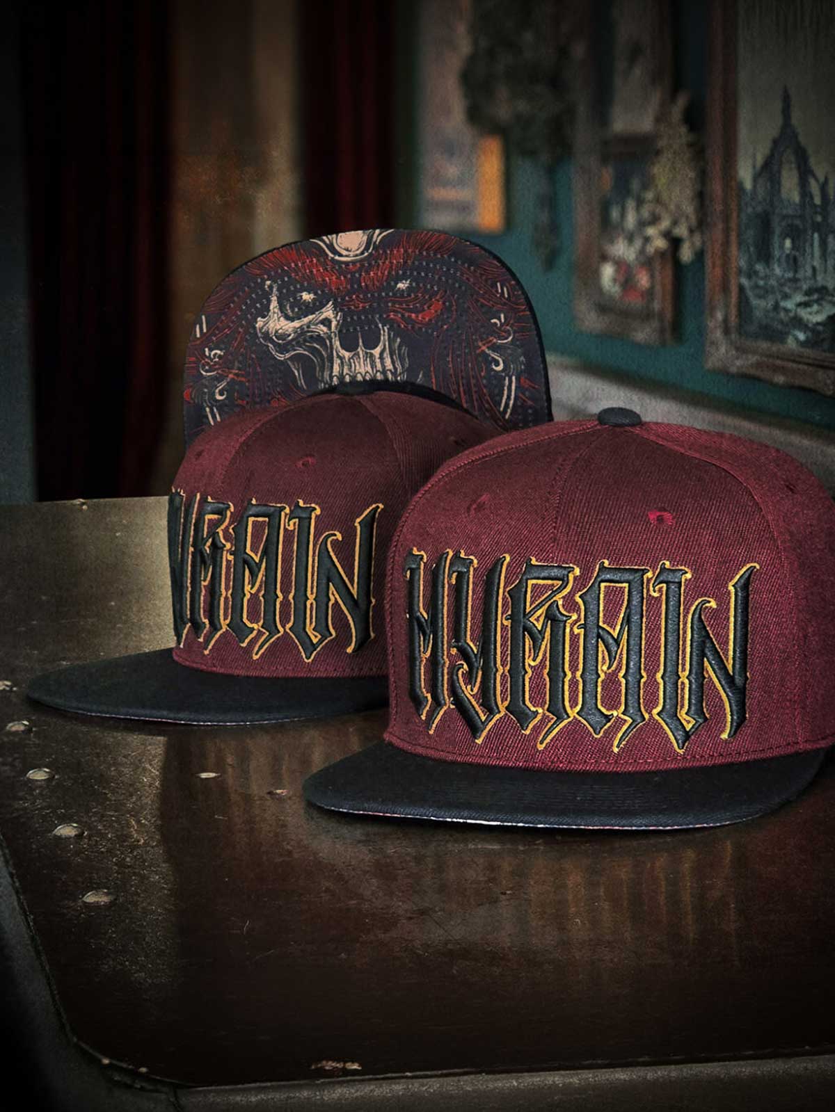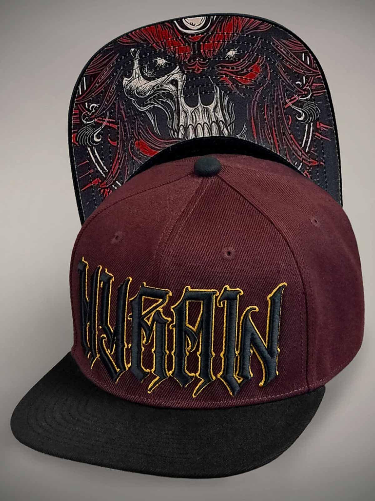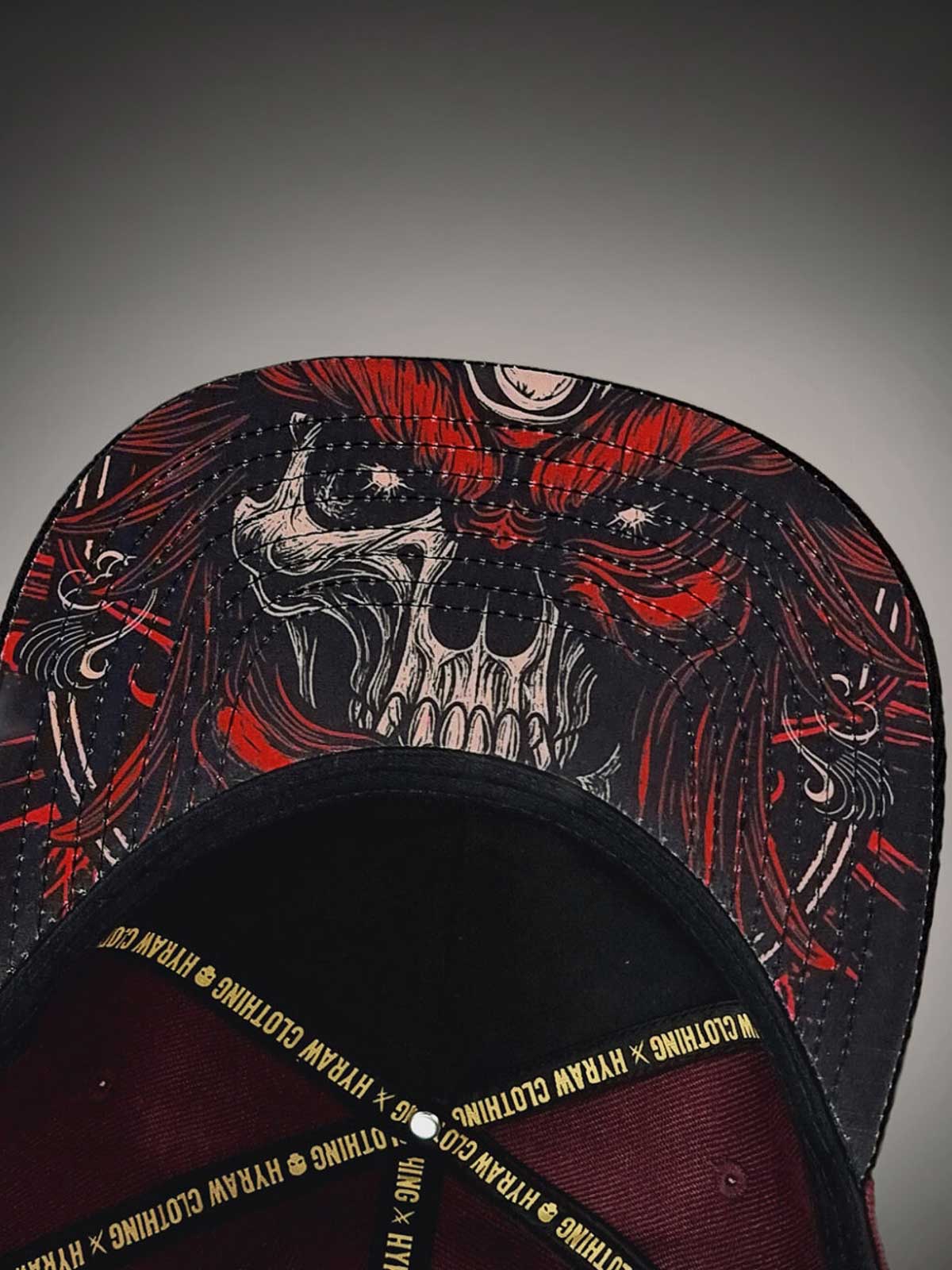 Wine-red cap with a flat brim, decorated with a custom black and yellow logo on the front and a yellow embroidered motif at the back. The underside of the brim features a unique design, giving the cap an extra eye-catching detail.