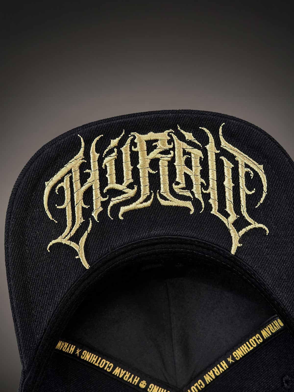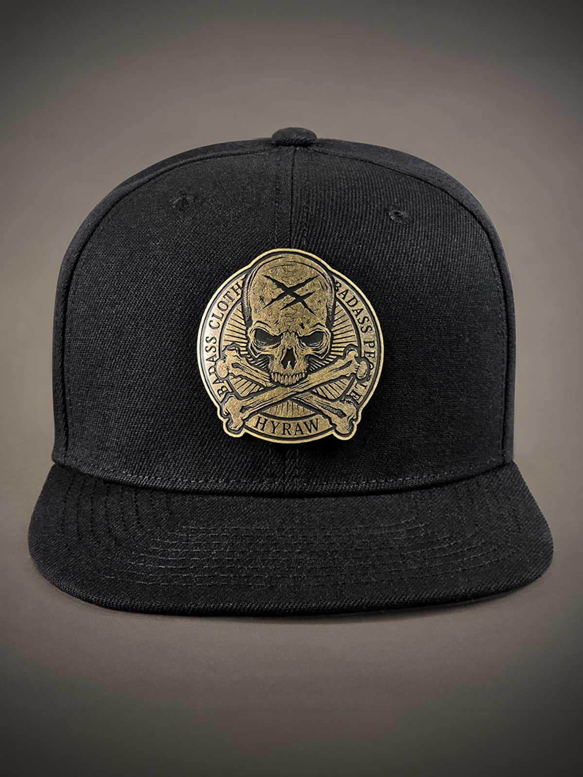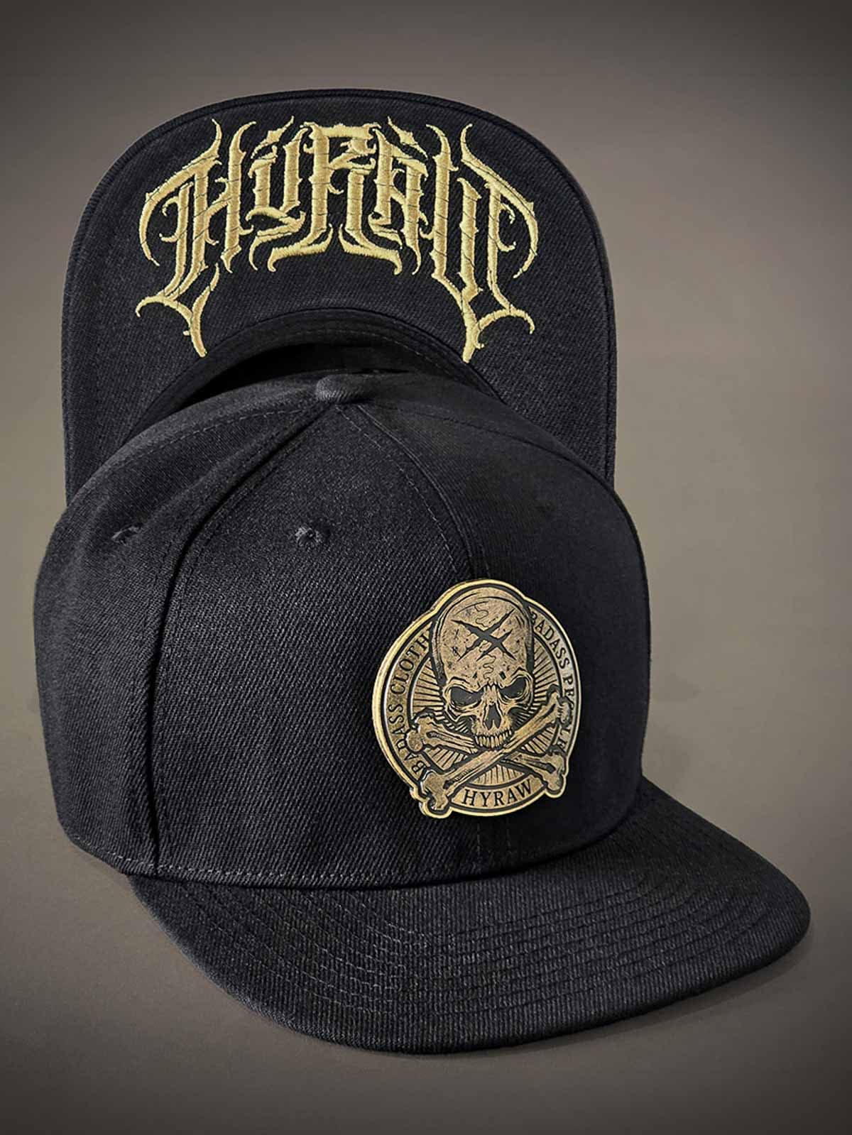 Black snapback cap with a flat brim. Decorated with a metal patch on the front featuring a skull motif. The underside of the brim is designed with an embroidered logo.
