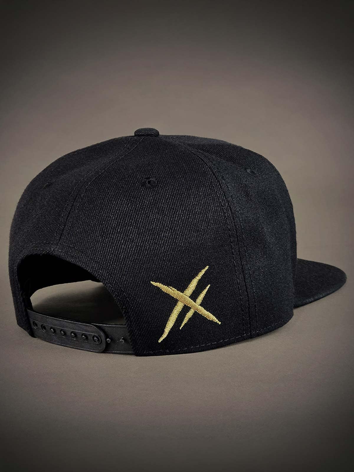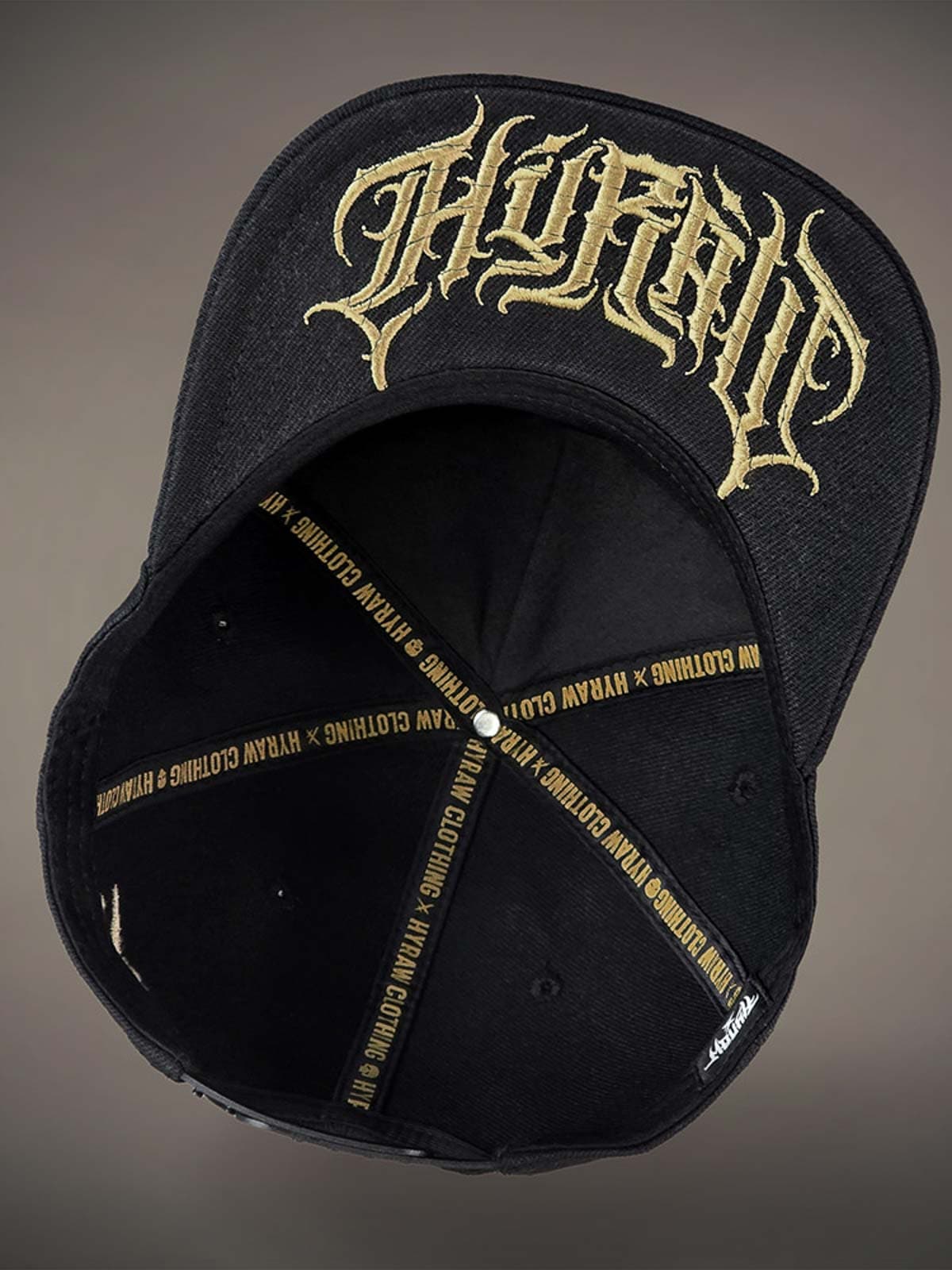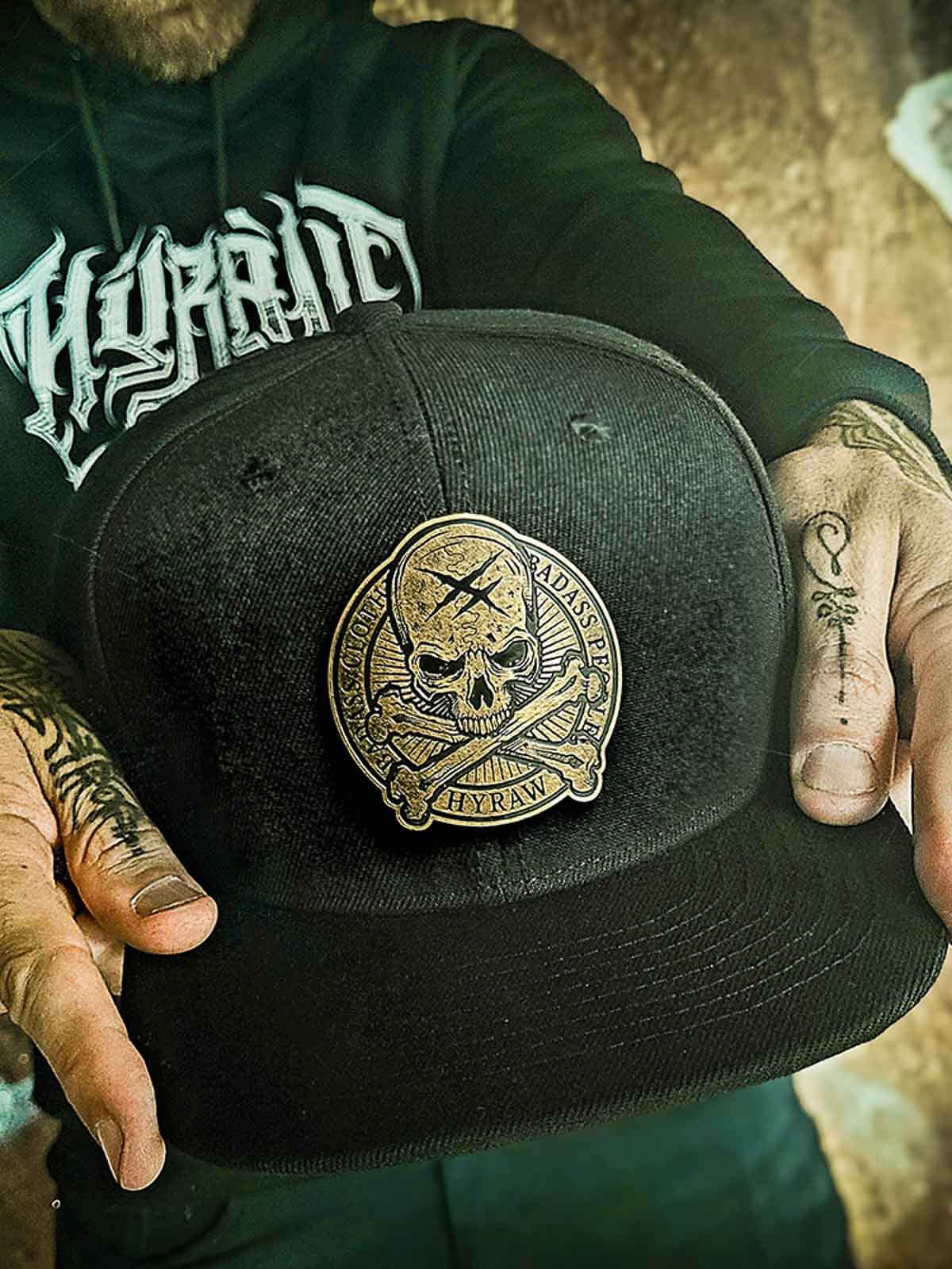 Black snapback cap with a flat brim. Decorated with a metal patch on the front featuring a skull motif. The underside of the brim is designed with an embroidered logo.