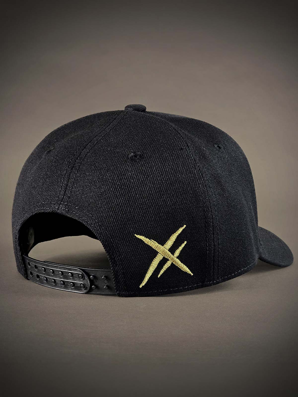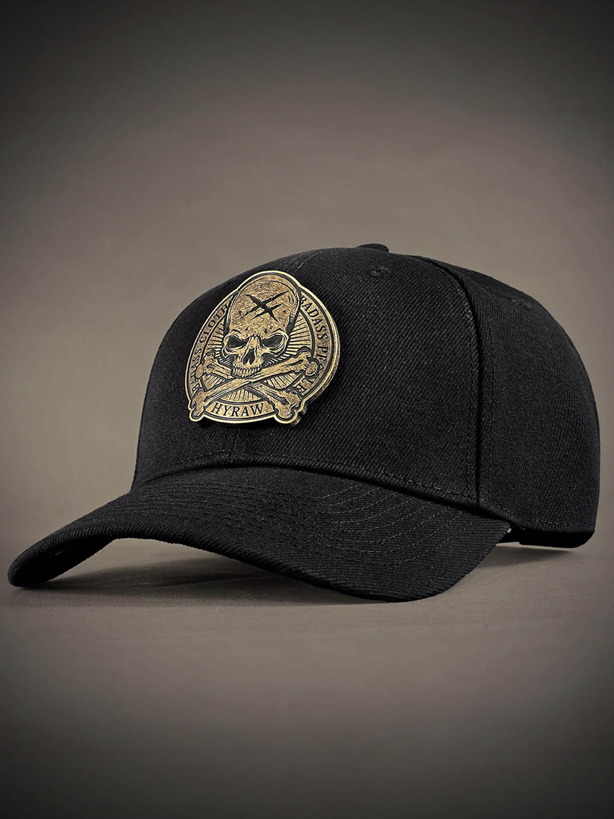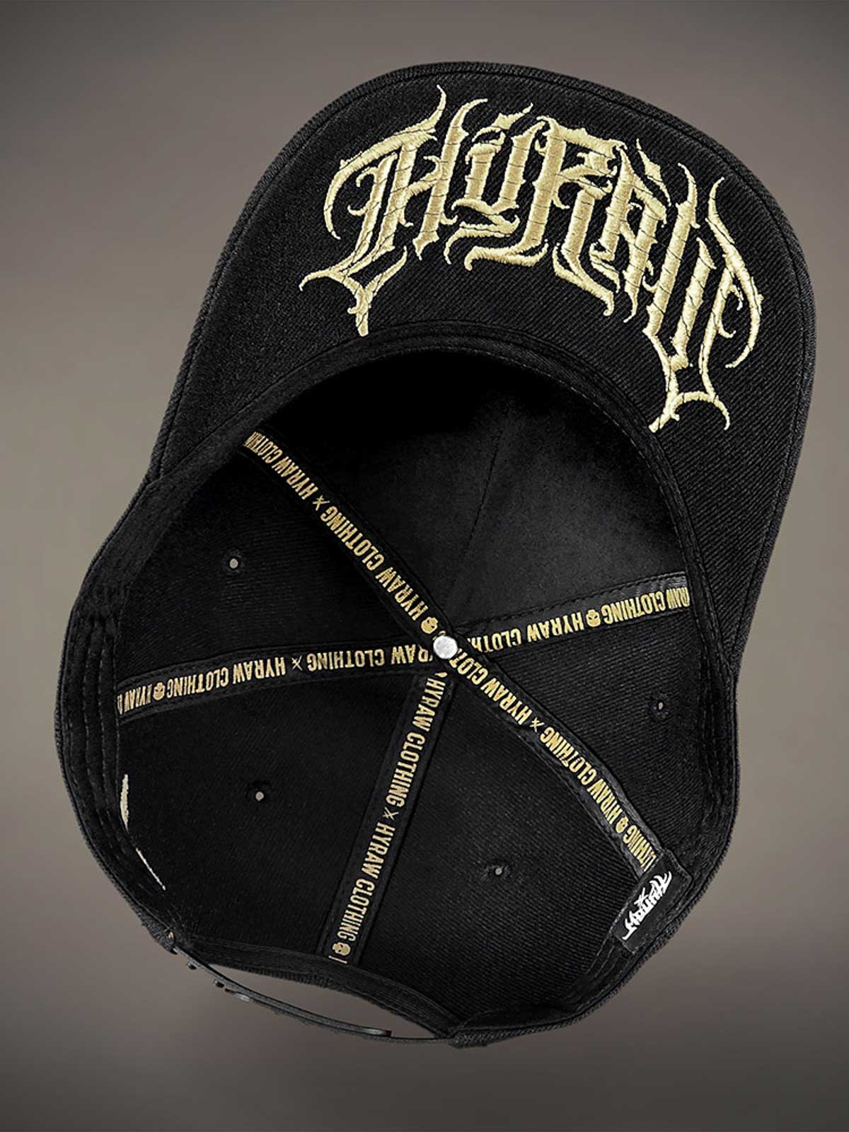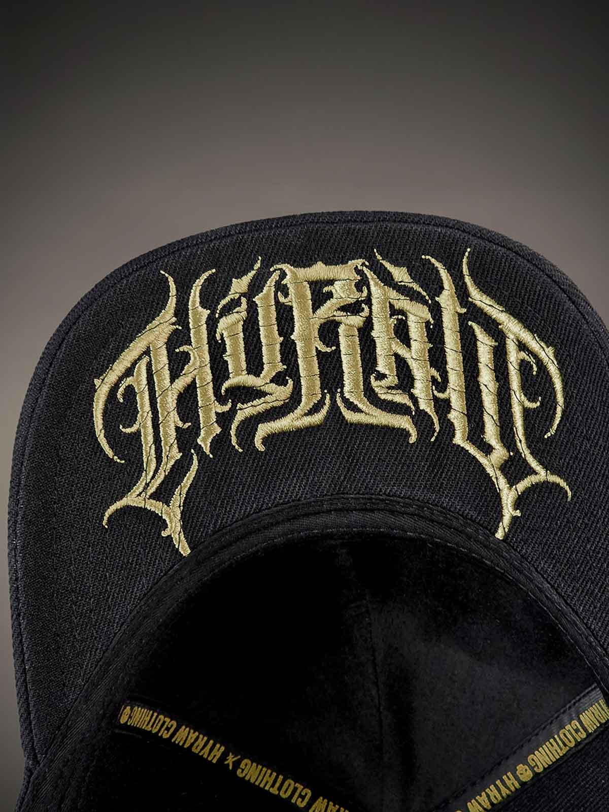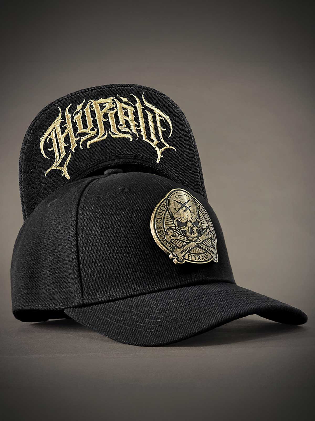 Black snapback cap with a curved brim. Decorated with a metal patch on the front featuring a skull motif. The underside of the brim is designed with an embroidered logo.