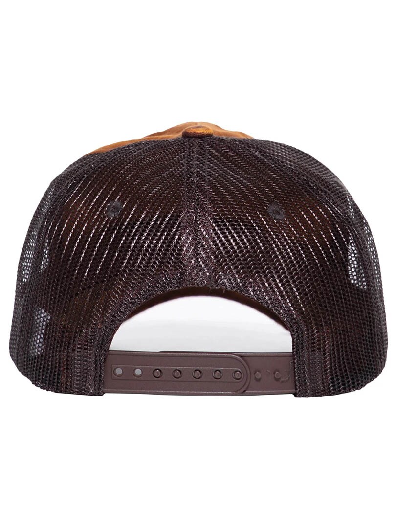 Brown cap with a classic trucker design and mesh back for optimal ventilation and comfort, perfect for everyday wear and warmer days. Designed with a curved brim featuring distressed details and a snapback closure. The front is finished with a custom logo print.
