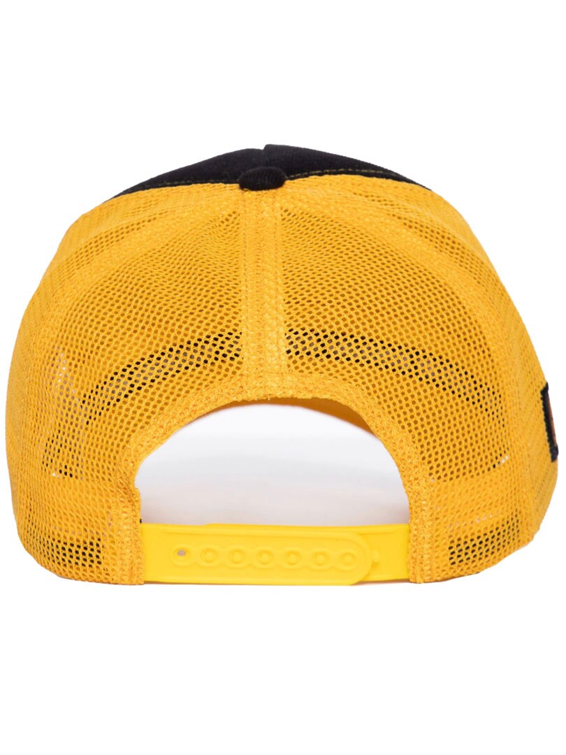 Black cap designed with orange mesh at the back and a custom print on the front. Features a curved brim and snapback closure. Perfect for sunny days, road trips, or simply as a statement piece in everyday wear.