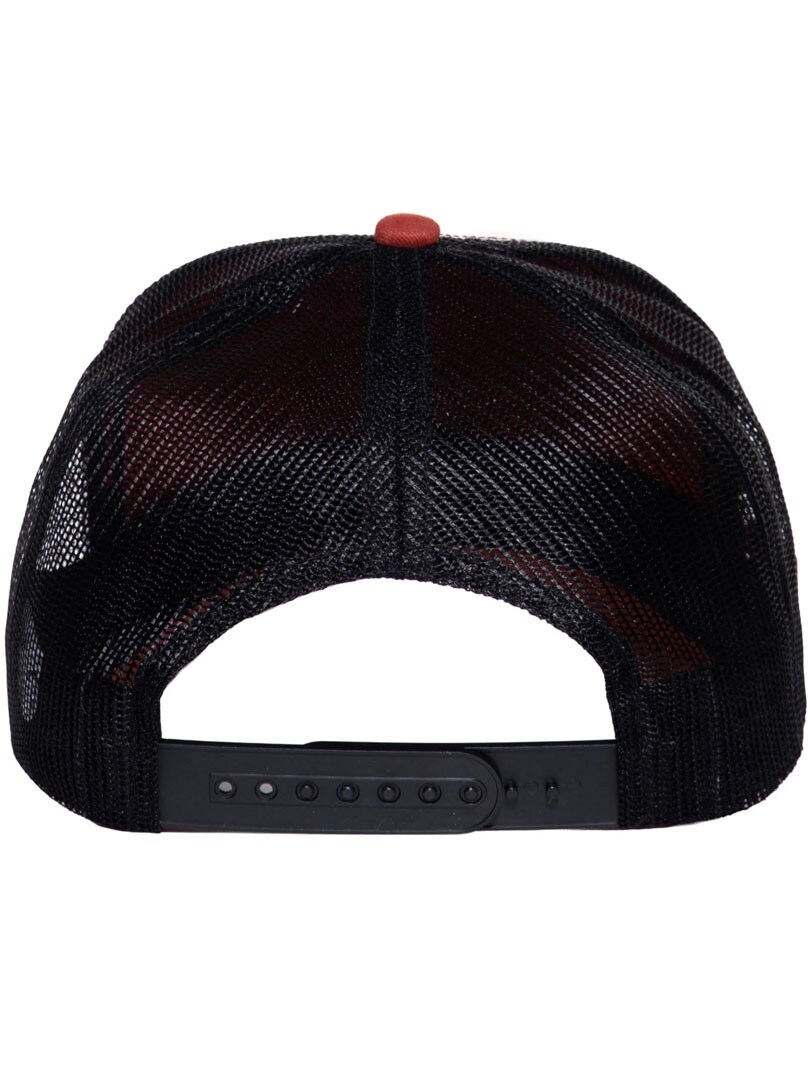 Stylish cap with a red brim and black mesh back. The front features a large, detailed patch showing two wild mechanic figures in action that really grabs attention. Designed with a snapback closure and a curved brim.
