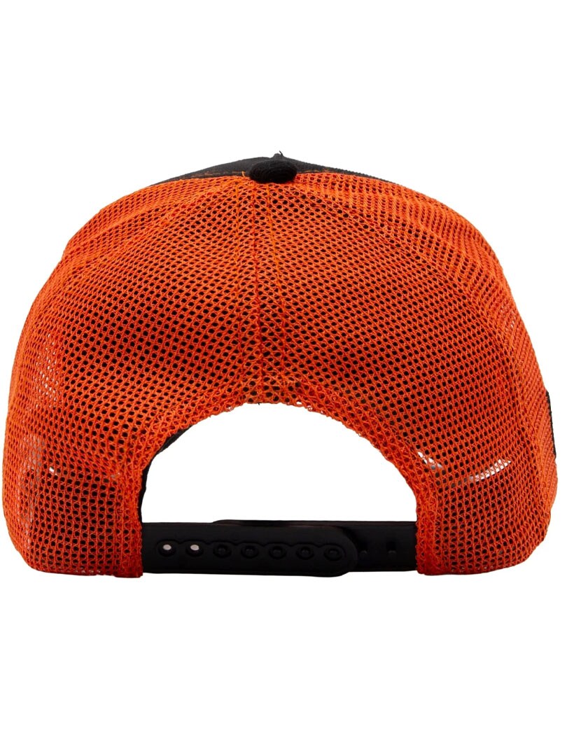 Bold black and orange cap with a strong contrast that instantly catches the eye and an expressive design that sets the tone right away. Features a mesh back panel for comfortable ventilation, pronounced contrast stitching, and an adjustable snapback for an all-day comfortable fit.