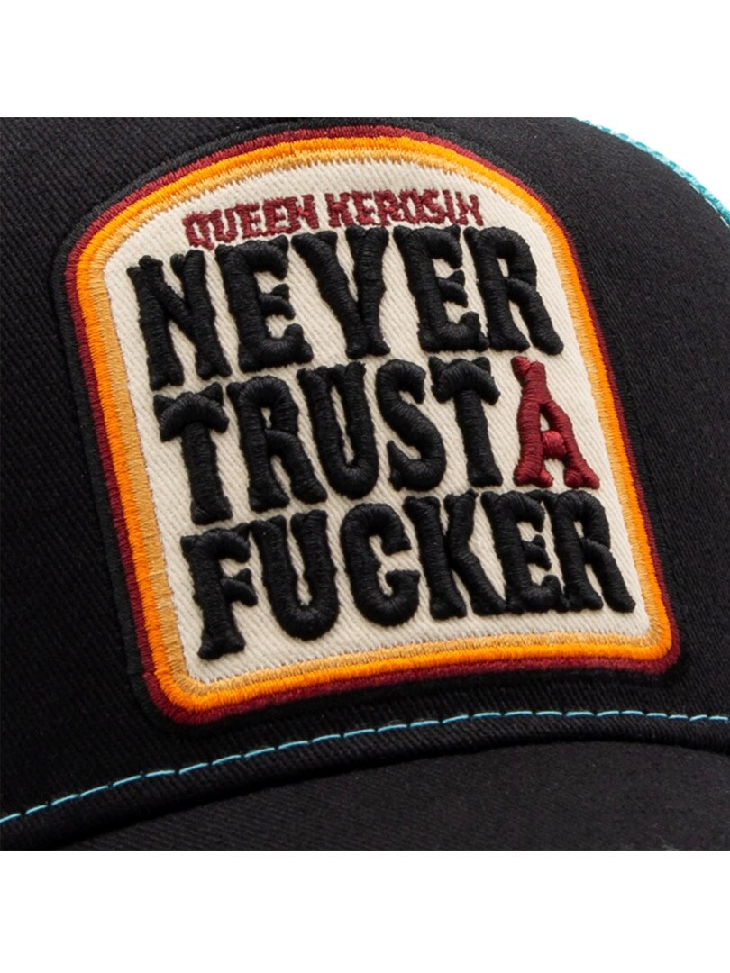 Cool cap in black and light blue with an embroidered logo on the front and the bold text “Never Trust a F*cker”. The adjustable snapback ensures a perfect fit on any head. A playful mix of attitude, humor, and genuine style. The cap features a curved brim and breathable mesh back, offering both style and great ventilation.