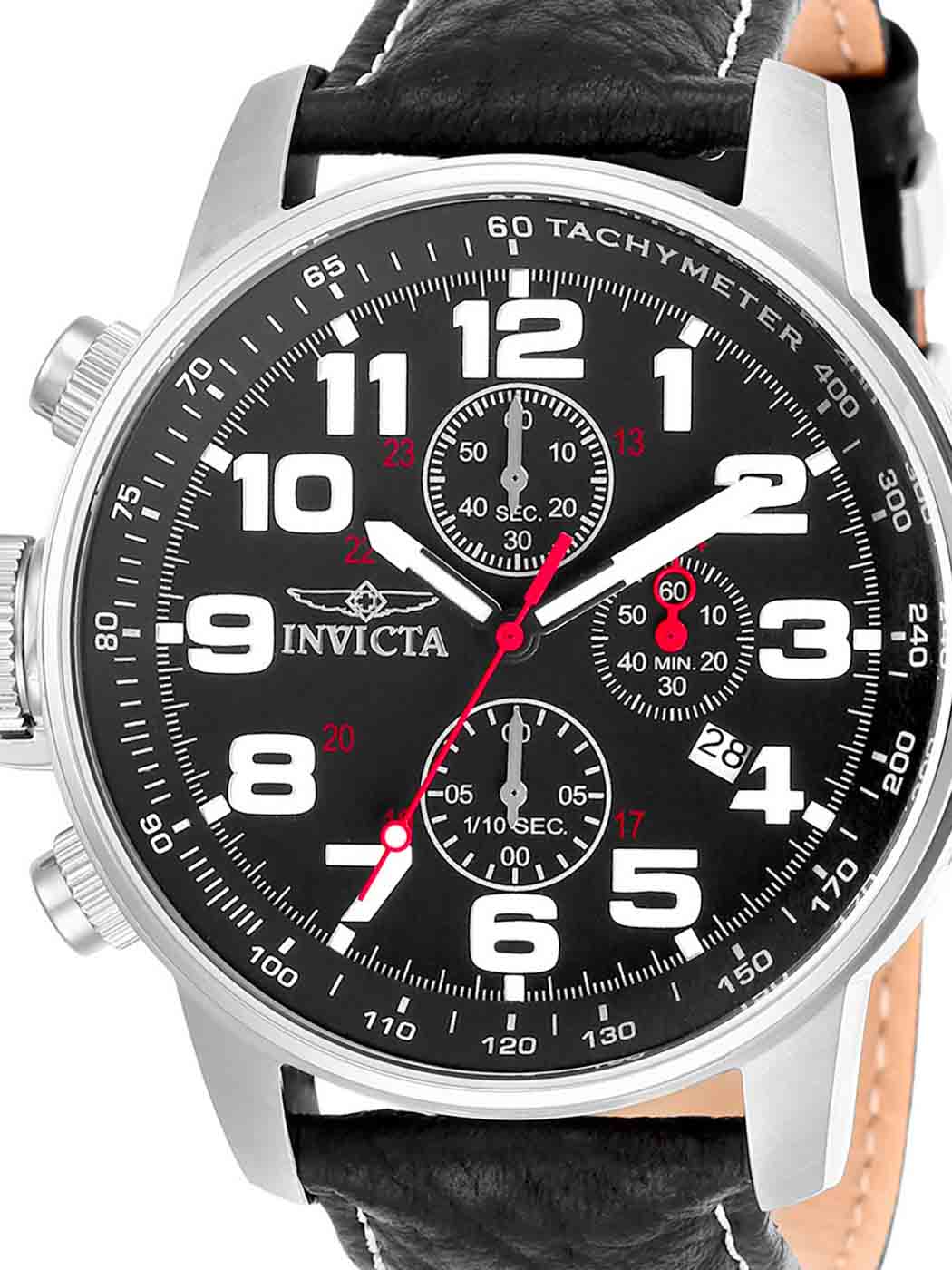 This stainless steel watch has a black leather strap. It is equipped with a stopwatch, a tachymeter scale, a 24-hour display, and a date window. It has scratch-resistant mineral glass and is powered by precise quartz movement. It is water resistant up to 100 meters, making it perfect for everyday use and activities.