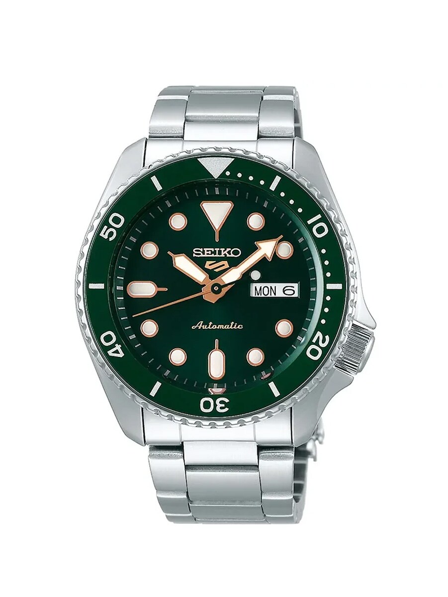 The Seiko 5 Sports SRPD63K1 is an exclusive men's watch that stands out with its deep green dial and elegant rose gold hands. The watch is powered by an automatic movement that is charged by your movements, which means no battery change is needed. The robust stainless steel case and bracelet are complemented by durable Hardlex glass and a clear day and date display. With a water resistance of 100 meters, this model is designed to handle both everyday challenges and sporty activities. A perfect combination of sporty functionality and sophisticated style for the modern man.