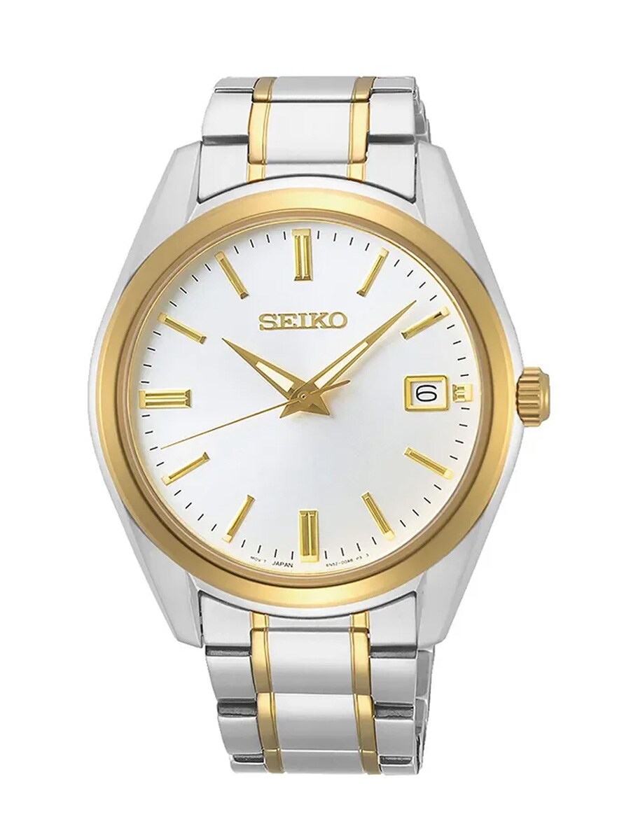 The Seiko SUR312P1 is a sophisticated men's watch in stainless steel with an elegant two-tone design in silver and gold. The white dial highlights the gold-colored hands and indexes, as well as the clear date display at three o'clock. The watch is protected by scratch-resistant sapphire glass, which ensures long-lasting clarity and durability. With a water resistance of 100 meters and a precise quartz movement, the model is both reliable and stylish for daily use. This watch offers a timeless aesthetic that perfectly suits both formal and casual occasions.