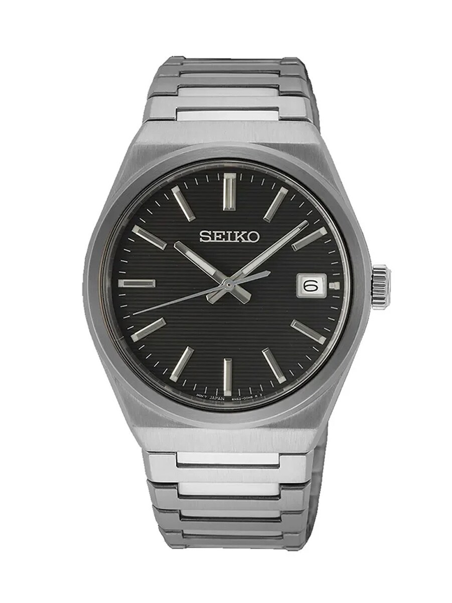Seiko SUR557P1 is a sophisticated men's watch that offers a classic design with a modern touch in stainless steel. The black dial features an elegant horizontal structure and clear silver-colored indices, as well as a date display at three o'clock. The watch is protected by scratch-resistant sapphire crystal, ensuring durability and clarity over time. With a reliable quartz movement and water resistance up to 100 meters, this is a versatile accessory for both everyday wear and special occasions. The integrated bracelet provides a comfortable fit and completes the stylish look.
