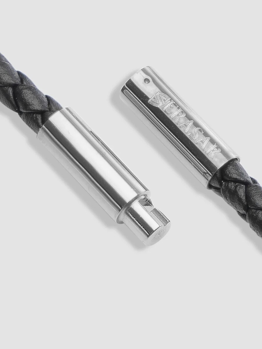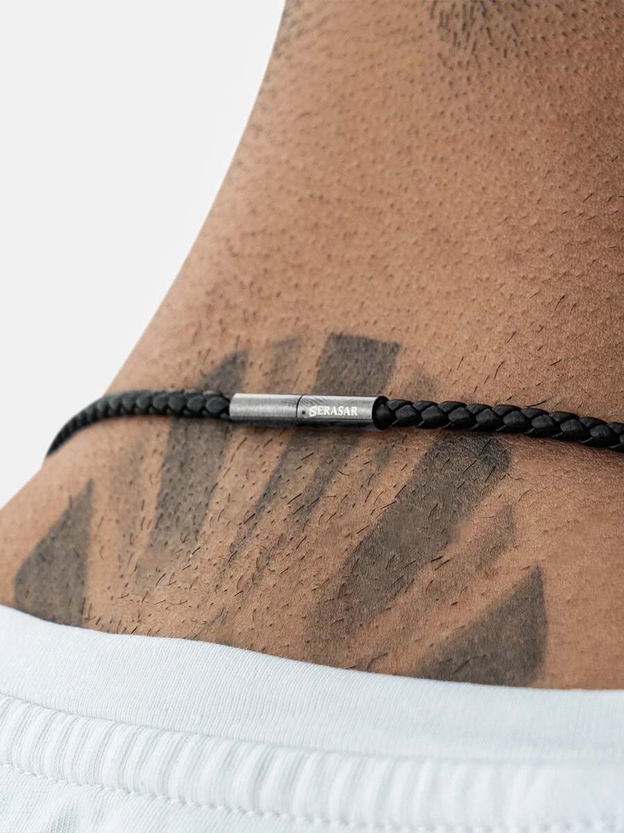 A sleek necklace featuring braided black leather and an elegant cross pendant in polished stainless steel. It closes smoothly with a twist lock that stays secure without creating pressure points. The leather cord is also slim enough for adding other pendants, making it perfect if you like to vary your style. A comfortable and timeless accessory for any occasion.